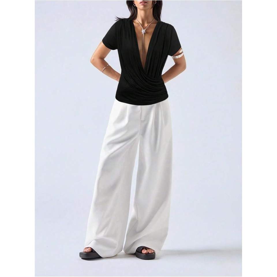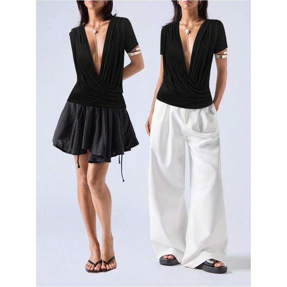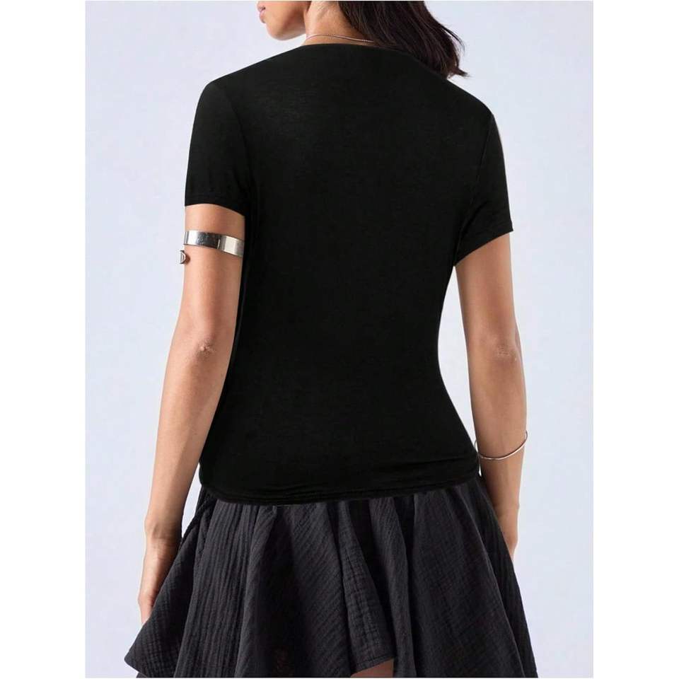 เสื้อยืดคอกว้างทรงเข้ารูปสำหรับผู้หญิง แขนสั้น ผ้าถักผสมคอตตอนและสแปนเด็กซ์ ระบายอากาศได้ดี เหมาะสำหรับฤดูร้อน