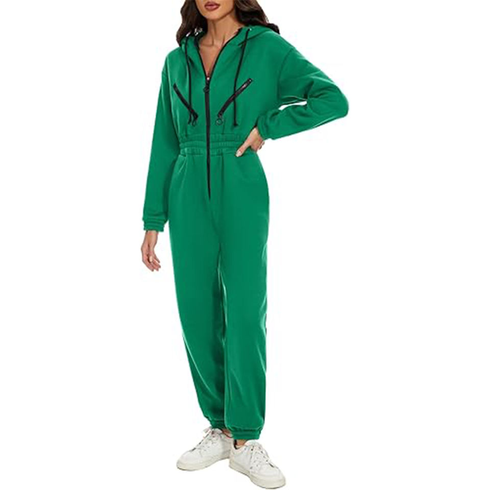 ชุดจั๊มสูทผ้าฟลีซแบบมีฮู้ด แขนยาว ซิปหน้า ปักลายสำหรับผู้หญิง สวมใส่สบาย เหมาะสำหรับใส่เล่นโยคะหรือเป็นชุดนอน มีกระเป๋า