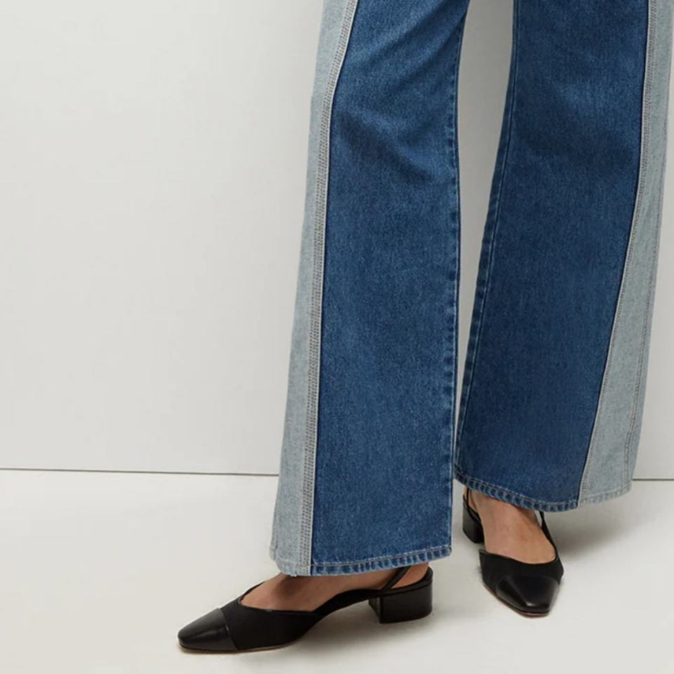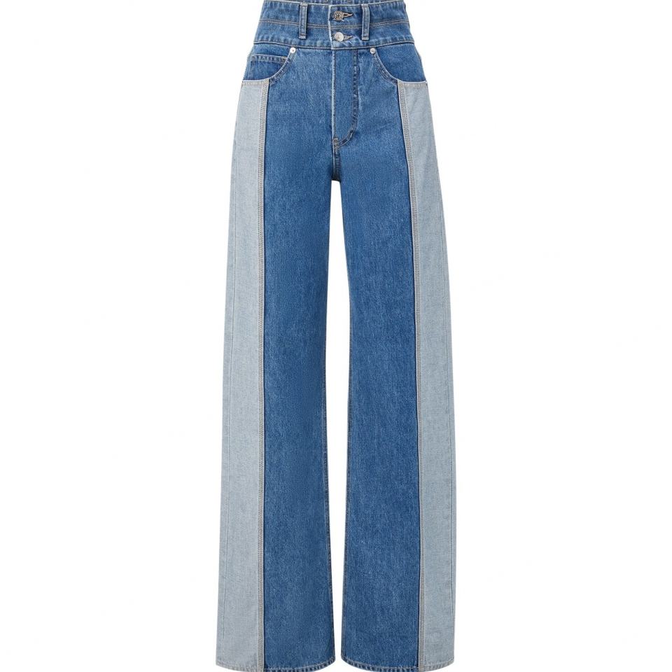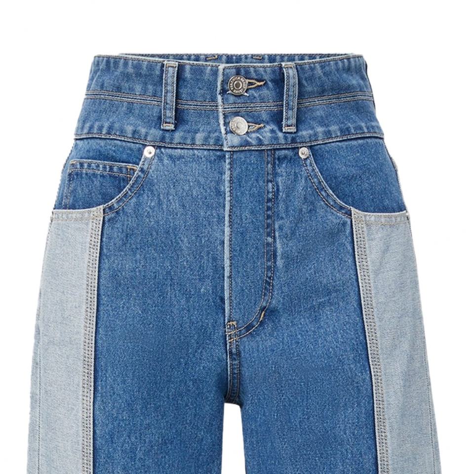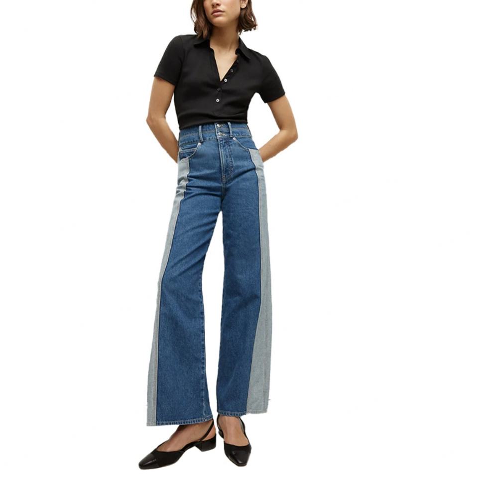 กางเกงยีนส์เดนิมสองสีทรงขากว้างสำหรับผู้หญิง ออกแบบโดยดีไซเนอร์แฟชั่น ผลิตจากผ้าญี่ปุ่น 100% กระดุมสองแถว เอวสูง ทรงหลวม