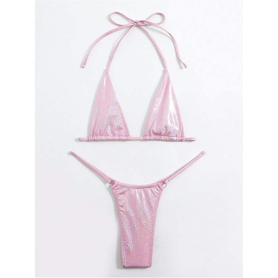 ชุดบิกินี่ผู้หญิงแบบกำหนดเอง ประดับกลิตเตอร์ เสื้อครอปแบบผูกคอ กางเกงจีสตริง ชุดว่ายน้ำสองชิ้น เนื้อผ้าเมทัลลิกมันวาว ยืดหยุ่นได้ ผลิตจากผ้าสแปนเด็กซ์และโพลีเอสเตอร์
