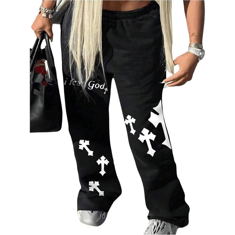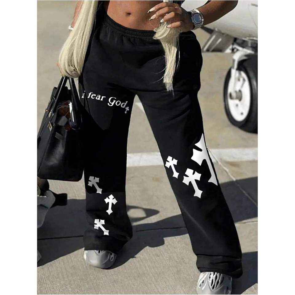 กางเกงวอร์มโกธิคทรงตรงเอวยางยืดสำหรับผู้หญิง สไตล์สตรีทแวร์ ผ้าเทอร์รี่ระบายอากาศได้ดี