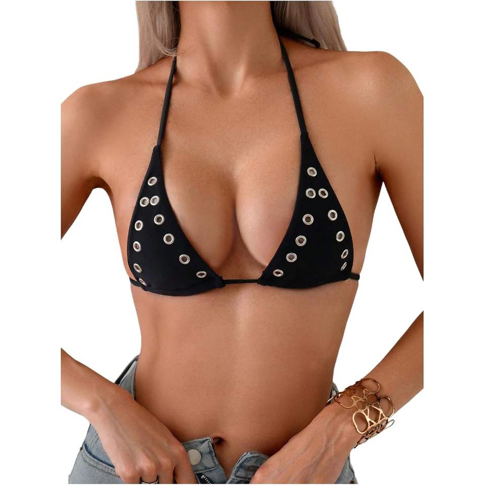 เสื้อบิกินี่แบบผูกคอสำหรับผู้หญิง รุ่น Grommet สีดำ ผ้าสแปนเด็กซ์ยืดหยุ่น ชุดว่ายน้ำ ชุดชายหาด
