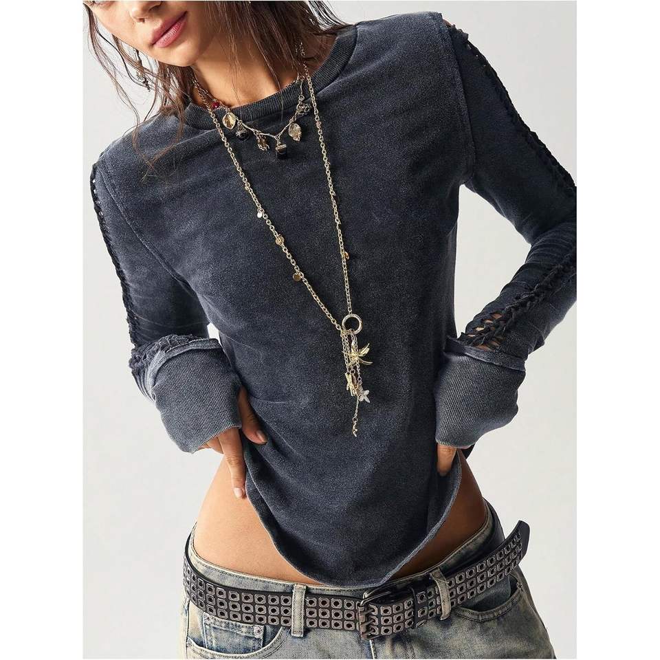 เสื้อถักแขนยาวผู้หญิงแบบเว้าคอ ทรงหลวม สไตล์วินเทจ ลำลอง