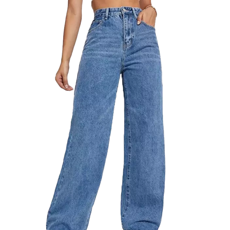 กางเกงยีนส์ขาบานสำหรับผู้หญิงกางเกงยีนส์ขาบานเอวสูงสีฟ้าฟอกแบบลำลองงานตามสั่ง