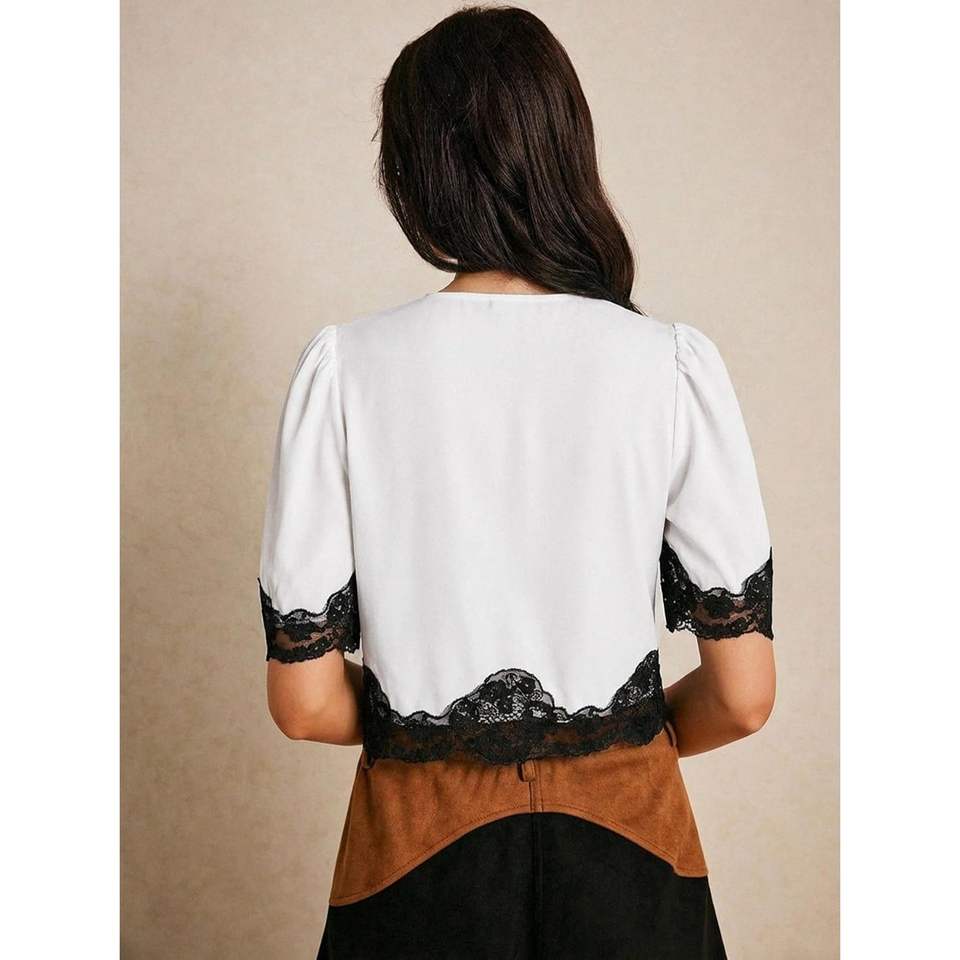 เสื้อครอปผู้หญิงลูกไม้แขนสั้นทรงบอลลูน คอวี ติดกระดุม ผ้าชีฟอง สวมใส่ได้ทุกวัน สวยสง่า