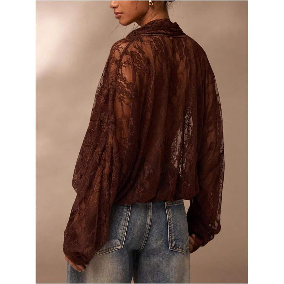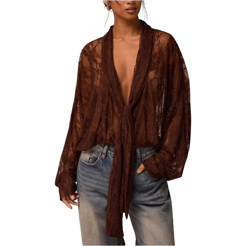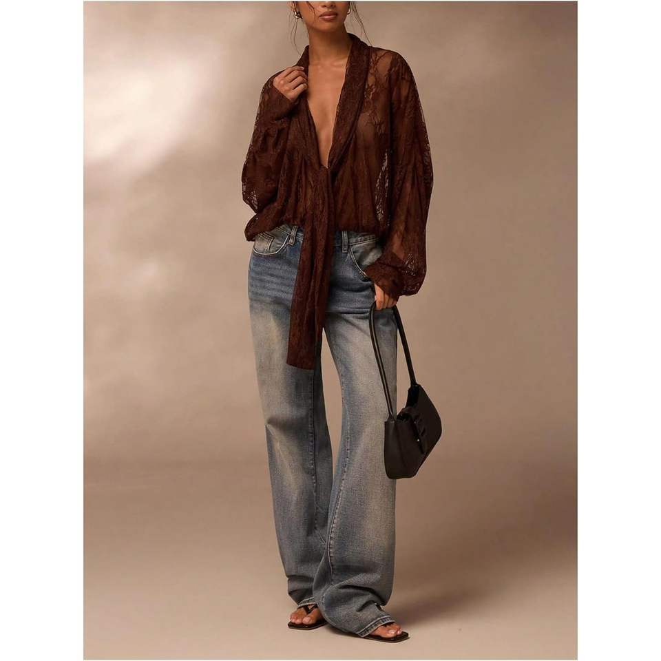 เสื้อผู้หญิงลูกไม้ตาข่ายแบบสั่งทำพิเศษ คอวีลึก แขนยาว ผ้าบาง ผูกโบว์ด้านหน้า ใส่ได้ทุกวัน