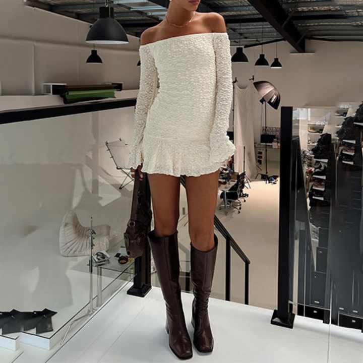 เดรสสั้นแขนยาวทรงบานเปิดไหล่เซ็กซี่เข้ารูปสำหรับผู้หญิง แต่งระบายชายกระโปรง เหมาะสำหรับงานปาร์ตี้กลางคืนและคลับ