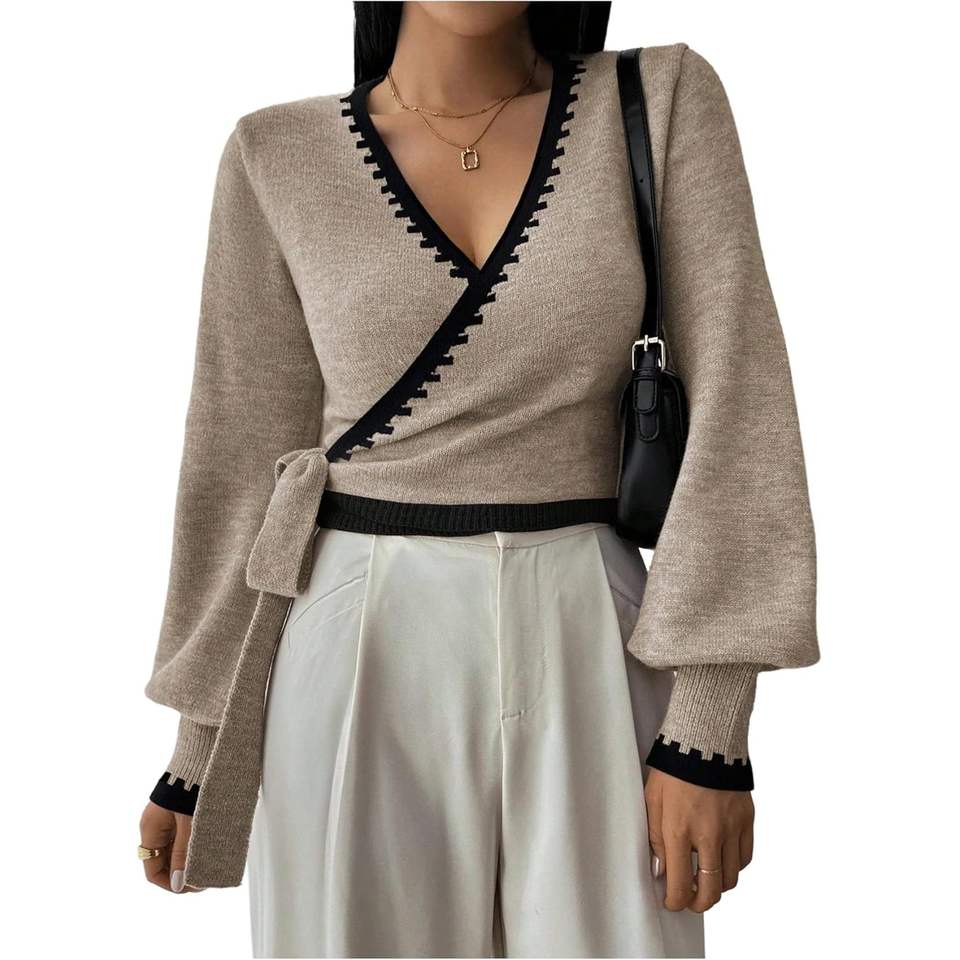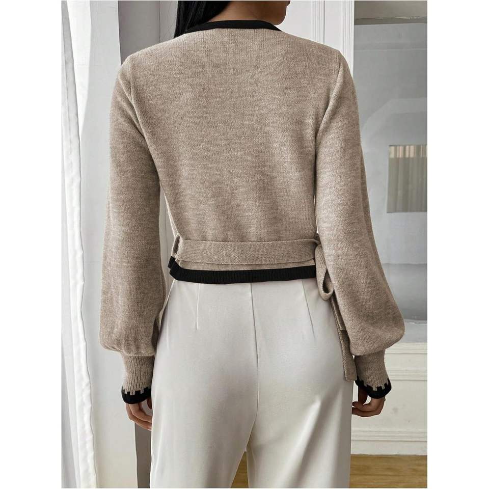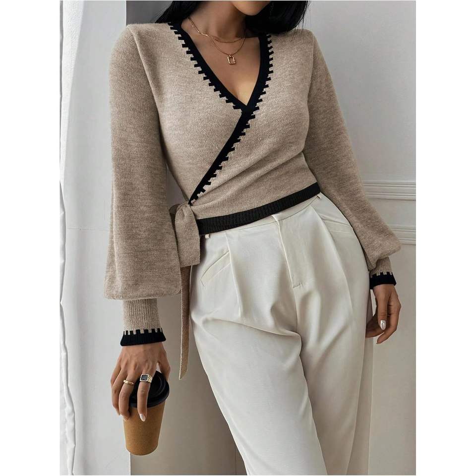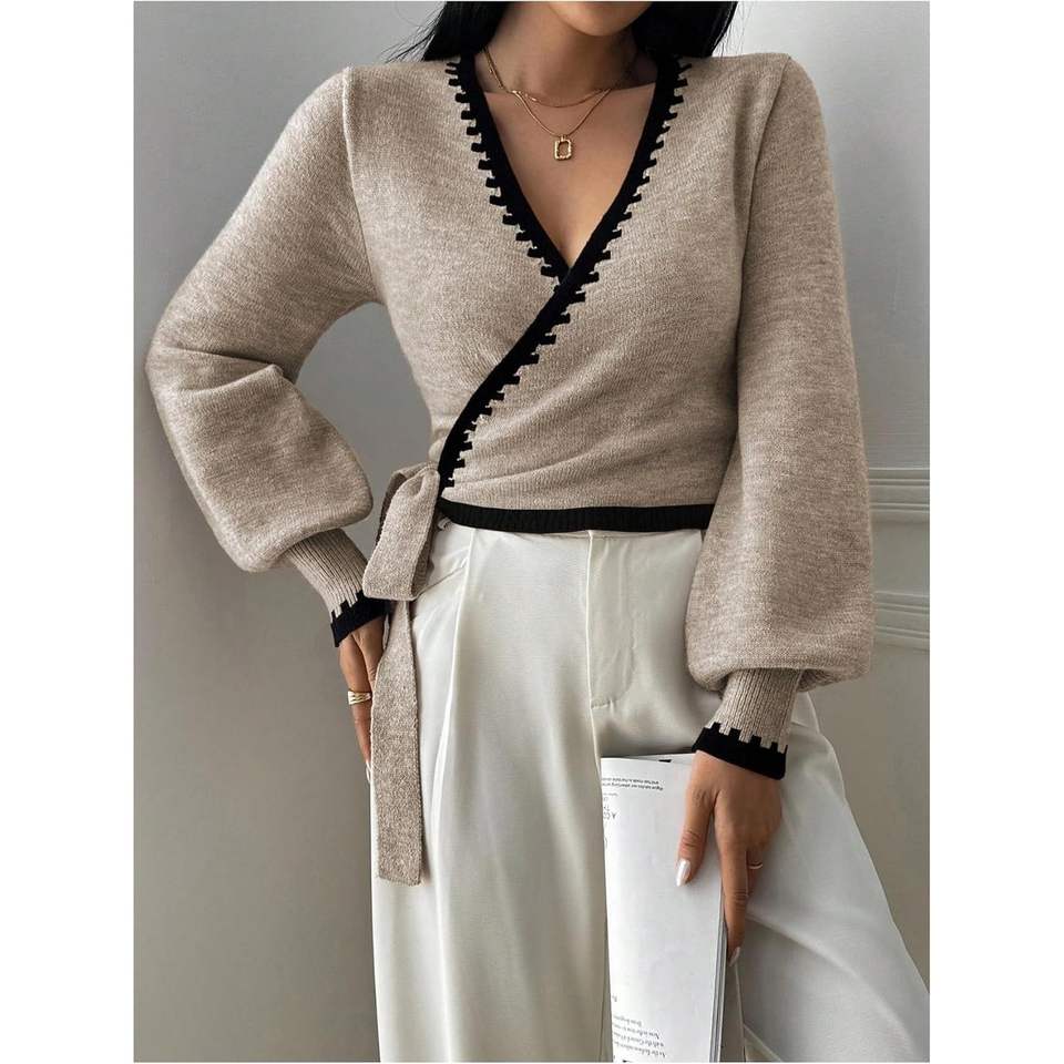 เสื้อสเวตเตอร์แขนยาวคอวีผูกเอวสำหรับผู้หญิง แขนทรงกระบอก ถักนิตติ้ง ครอปท็อป สไตล์หรูหรา เหมาะสำหรับใส่ทำงานในฤดูใบไม้ร่วง