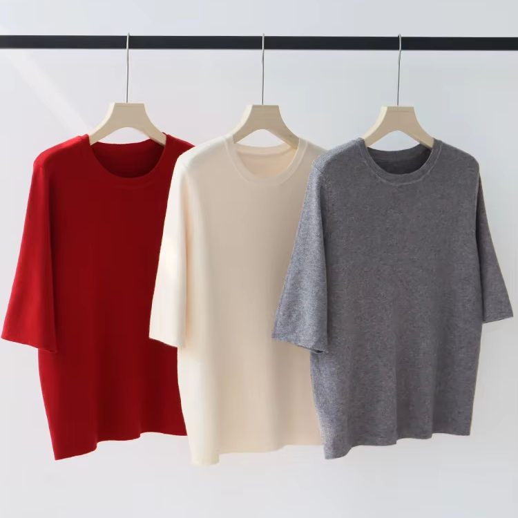 เสื้อยืดแขนสั้นคอกลมลำลองสำหรับผู้หญิง ทรงเข้ารูป สีพื้น ผ้าถัก ระบายอากาศได้ดี เหมาะสำหรับฤดูร้อน