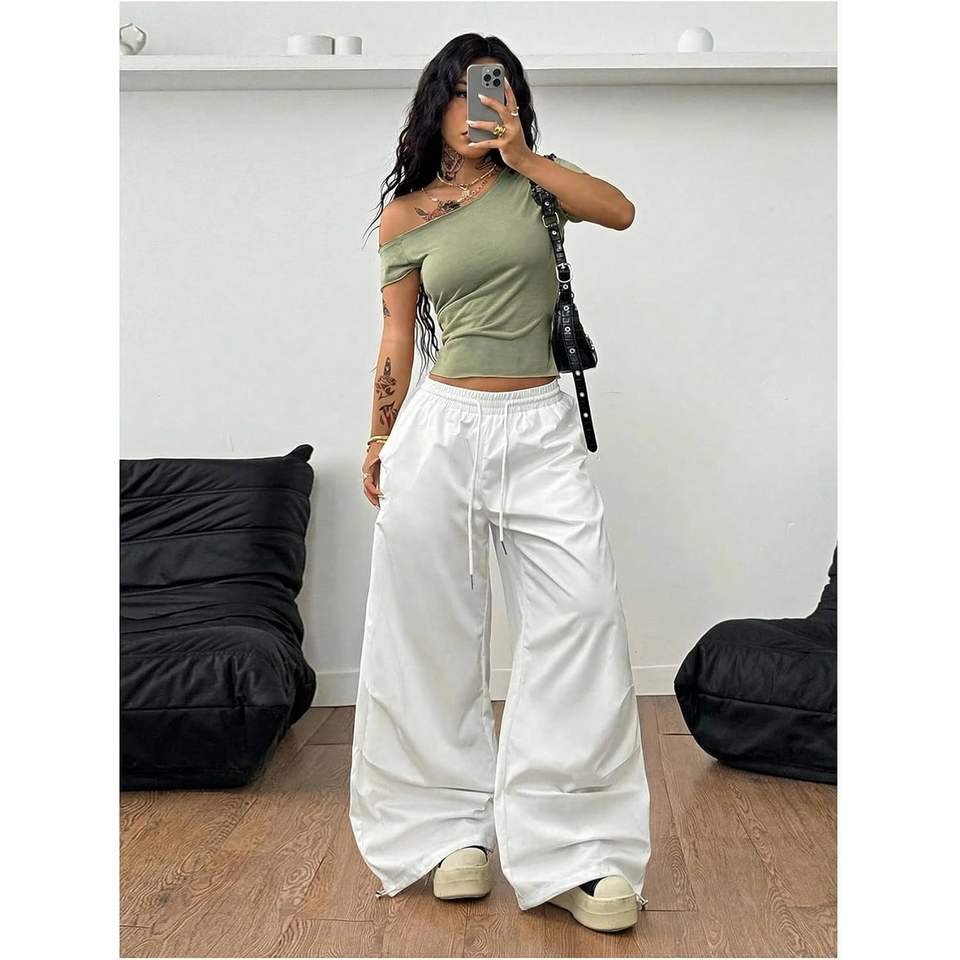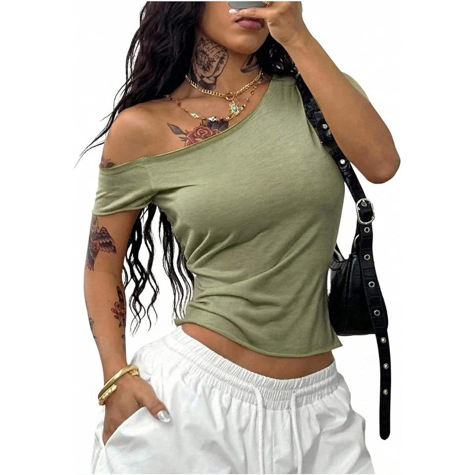 เสื้อครอปท็อปผู้หญิงแบบเปิดไหล่ แขนสั้น ทรงเข้ารูป ผ้าถัก สไตล์ Y2K แบบไม่สมมาตร