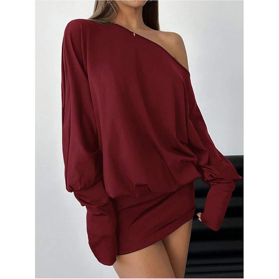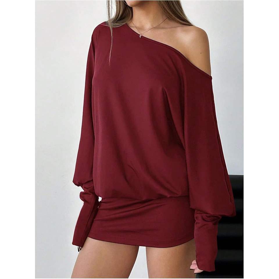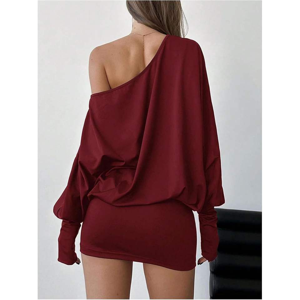 เดรสสั้นแขนยาวเปิดไหล่ทรงเข้ารูปผ้าชีฟองสำหรับผู้หญิง ดีไซน์ไม่สมมาตร เหมาะสำหรับใส่ไปเที่ยวคลับ