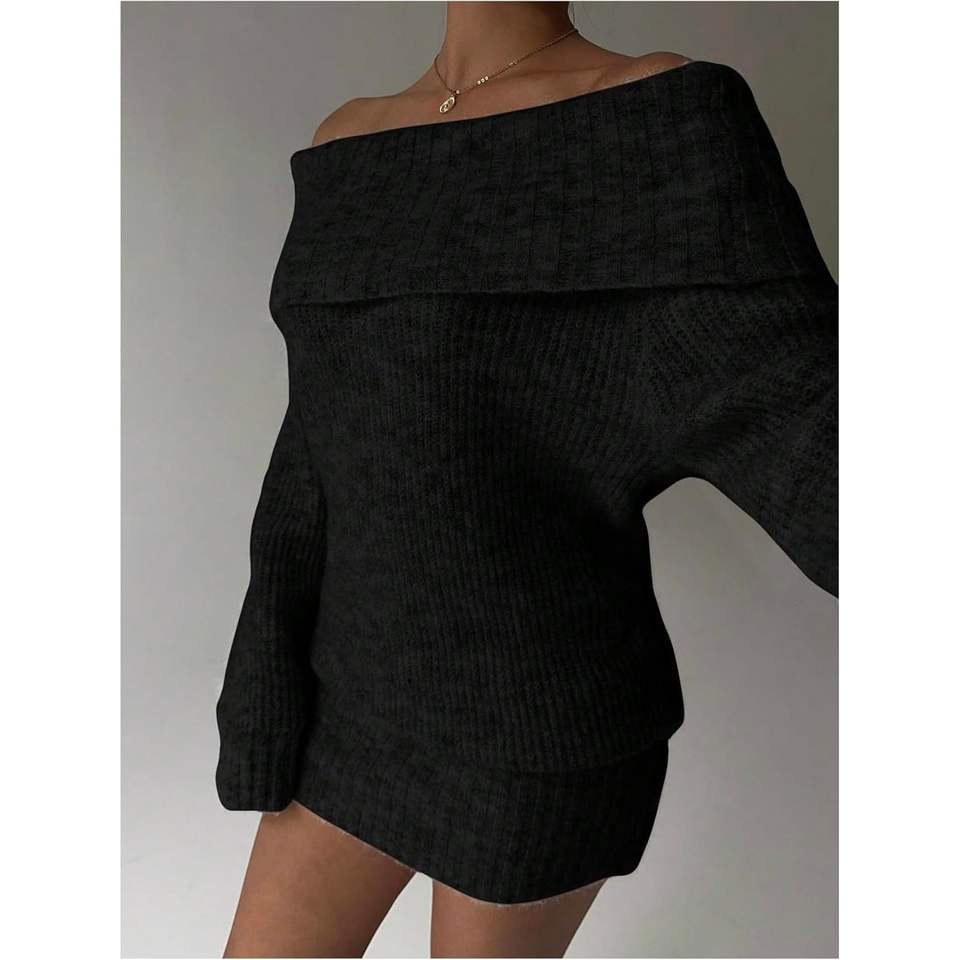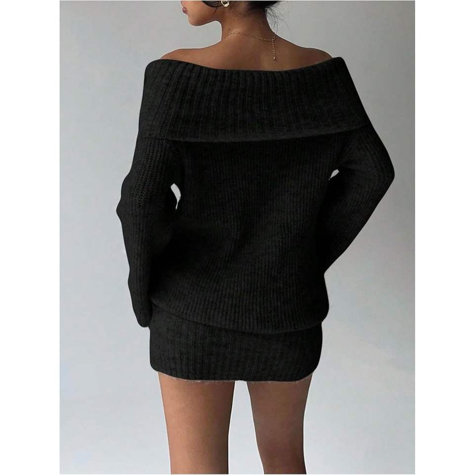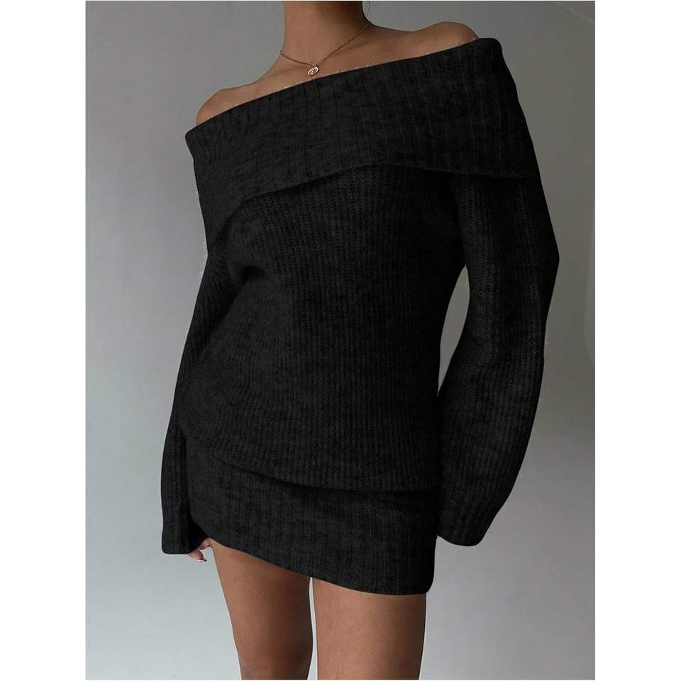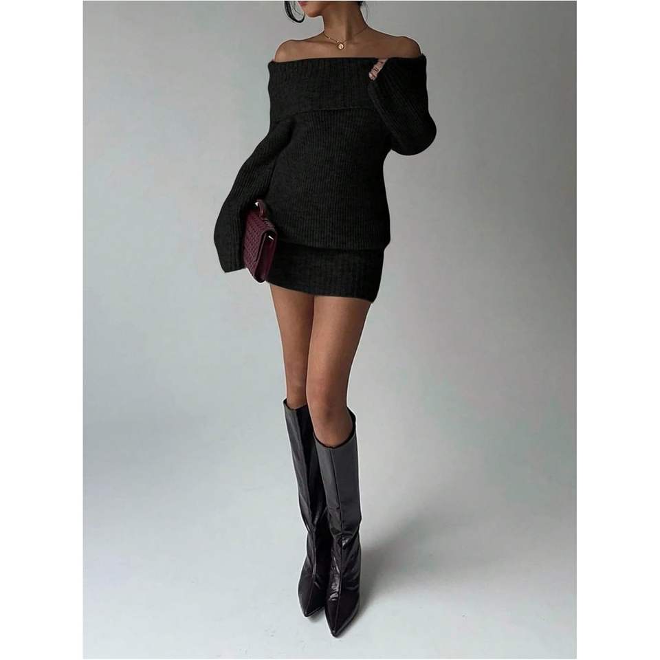 เดรสสั้นแบบเปิดไหล่สำหรับผู้หญิง แขนยาว ทรงเข้ารูป ผ้าถัก สไตล์ลำลอง ทรงเอ-ไลน์