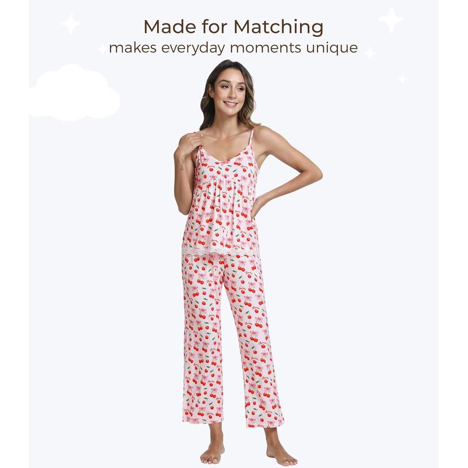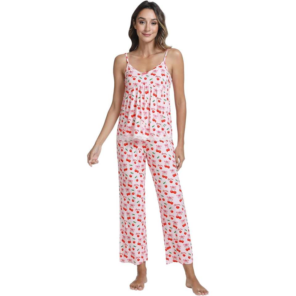 ชุดนอนผู้หญิงผ้าโมดอลแบบกำหนดเอง เสื้อสายเดี่ยวคอกว้างพิมพ์ลายเชอร์รี่โบว์ พร้อมกางเกงขายาว ชุดนอนผ้าวิสโคสจากไม้ไผ่นุ่มสบาย