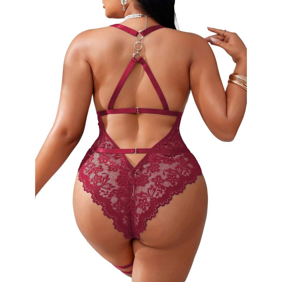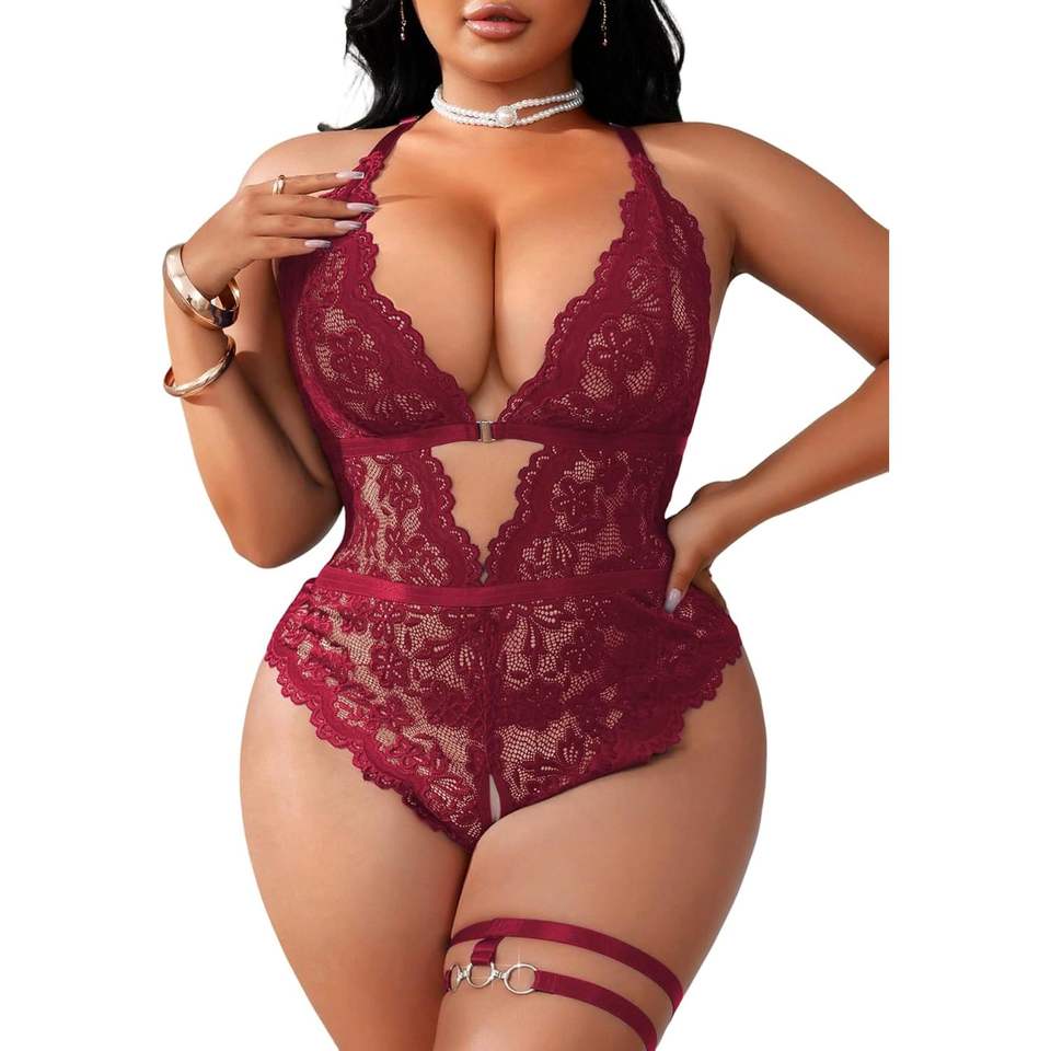 ชุดบอดี้สูทลูกไม้ไซส์ใหญ่สำหรับผู้หญิง คอวีลึก เอวสูง ชุดชั้นในแบบชิ้นเดียว พร้อมสายรัดขา