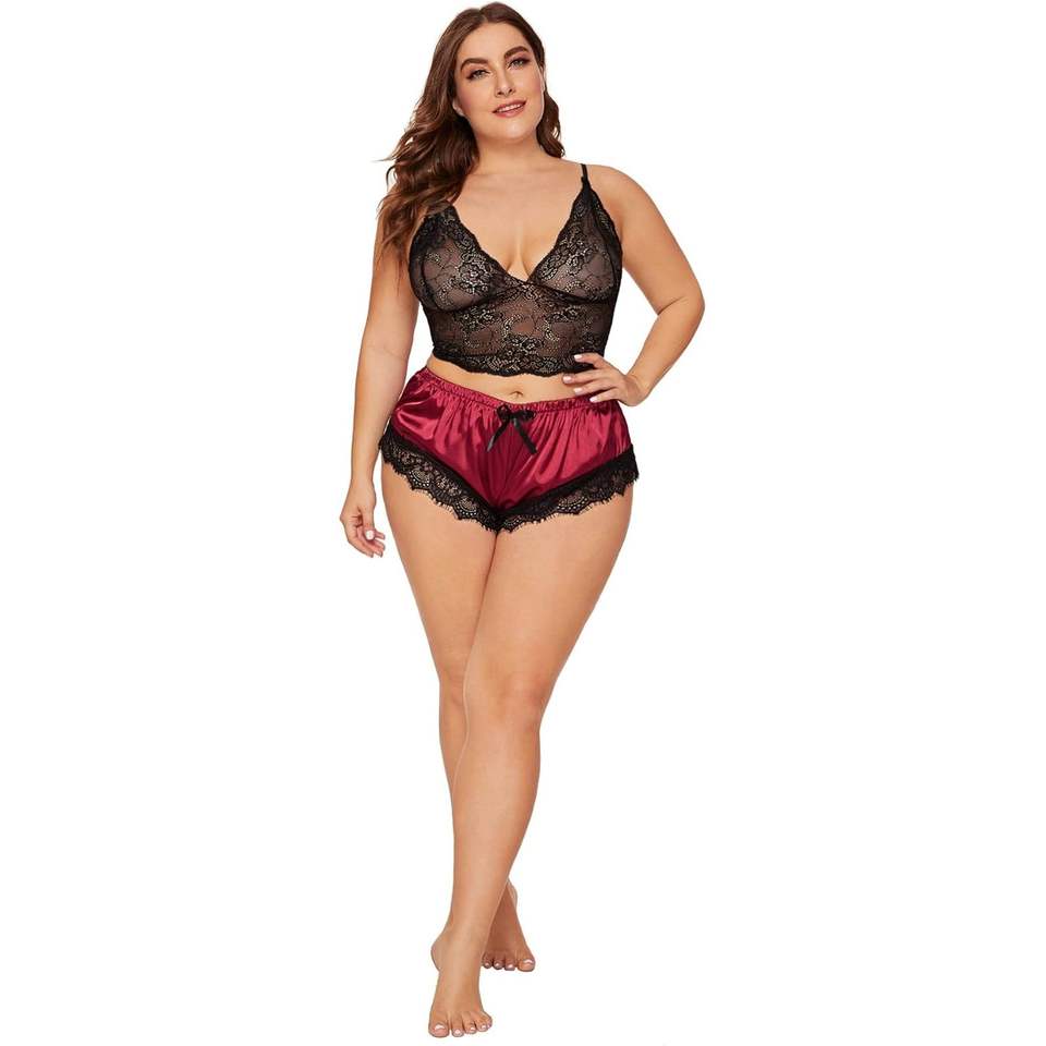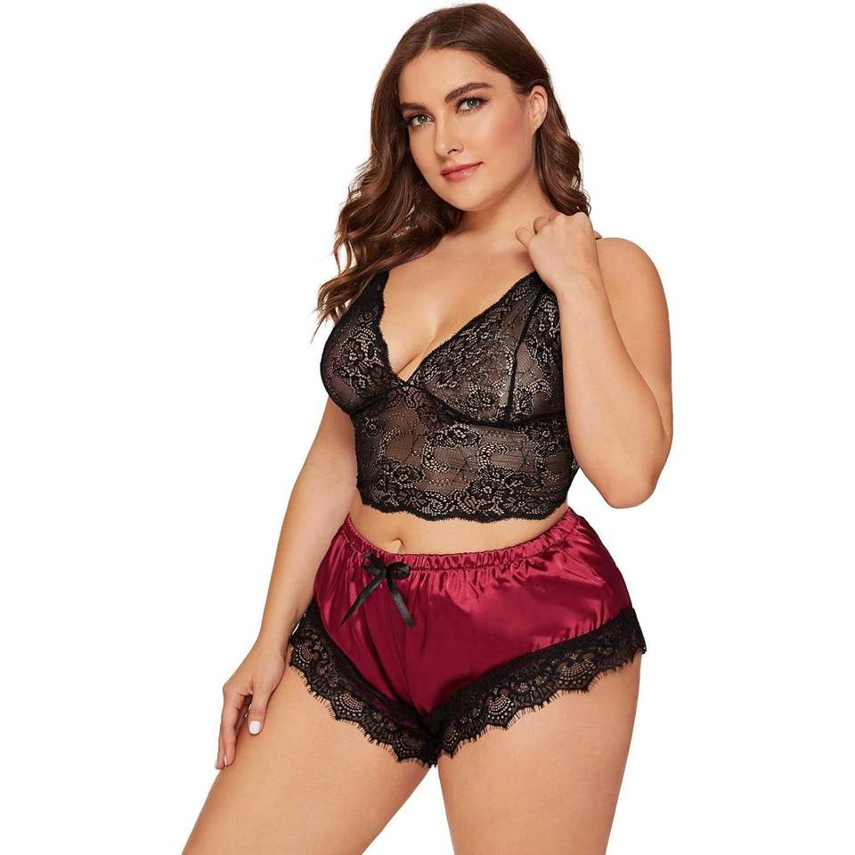 ชุดชั้นในลูกไม้สำหรับผู้หญิงไซส์ใหญ่ ชุดนอนบราเล็ตต์และกางเกงขาสั้น ชุดนอนเซ็กซี่สองชิ้น