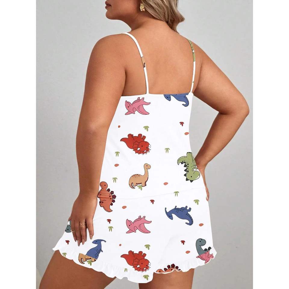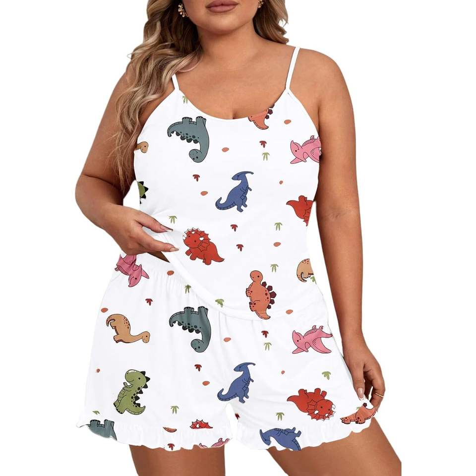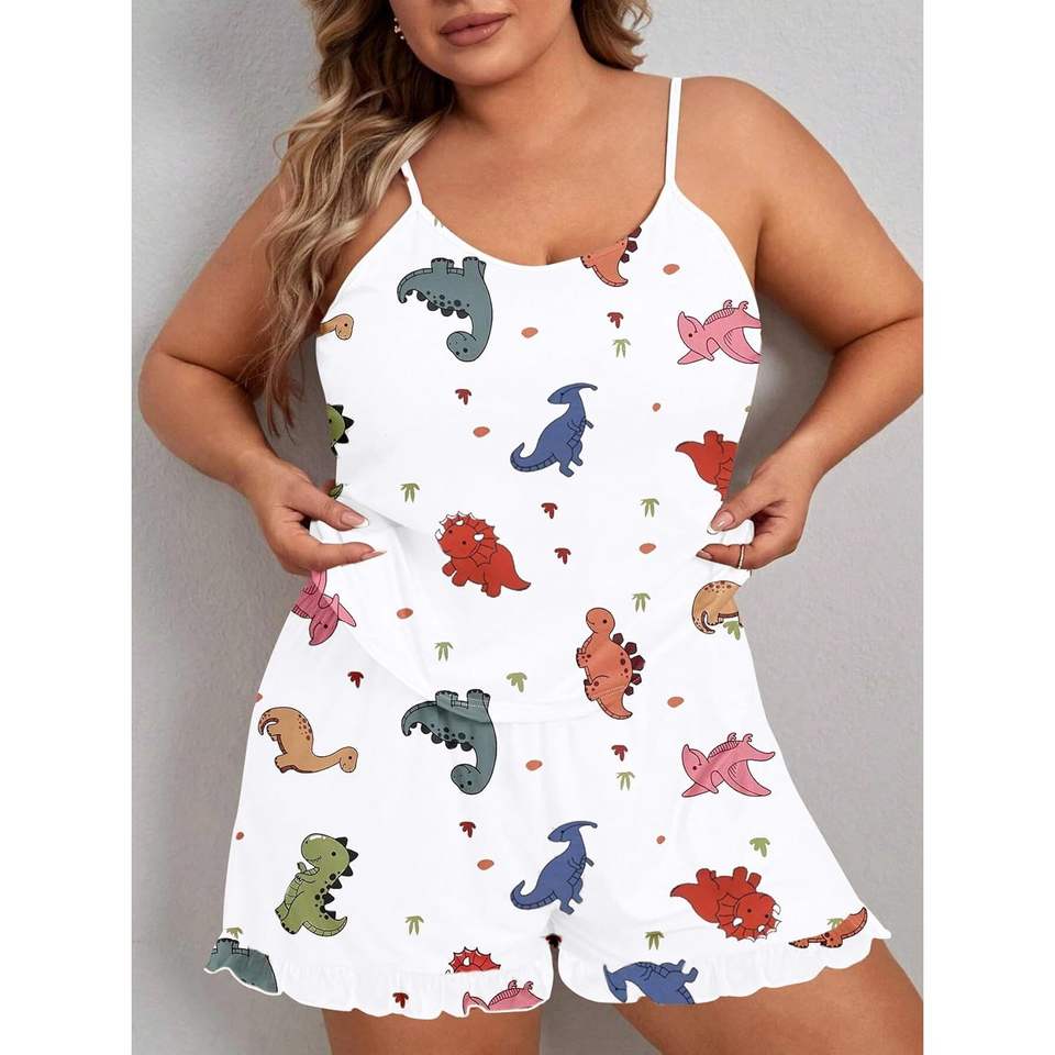 ชุดนอนผู้หญิงไซส์ใหญ่ลายการ์ตูน เสื้อสายเดี่ยวและกางเกงขาสั้น ชุดลำลองฤดูร้อน ผ้าทอ