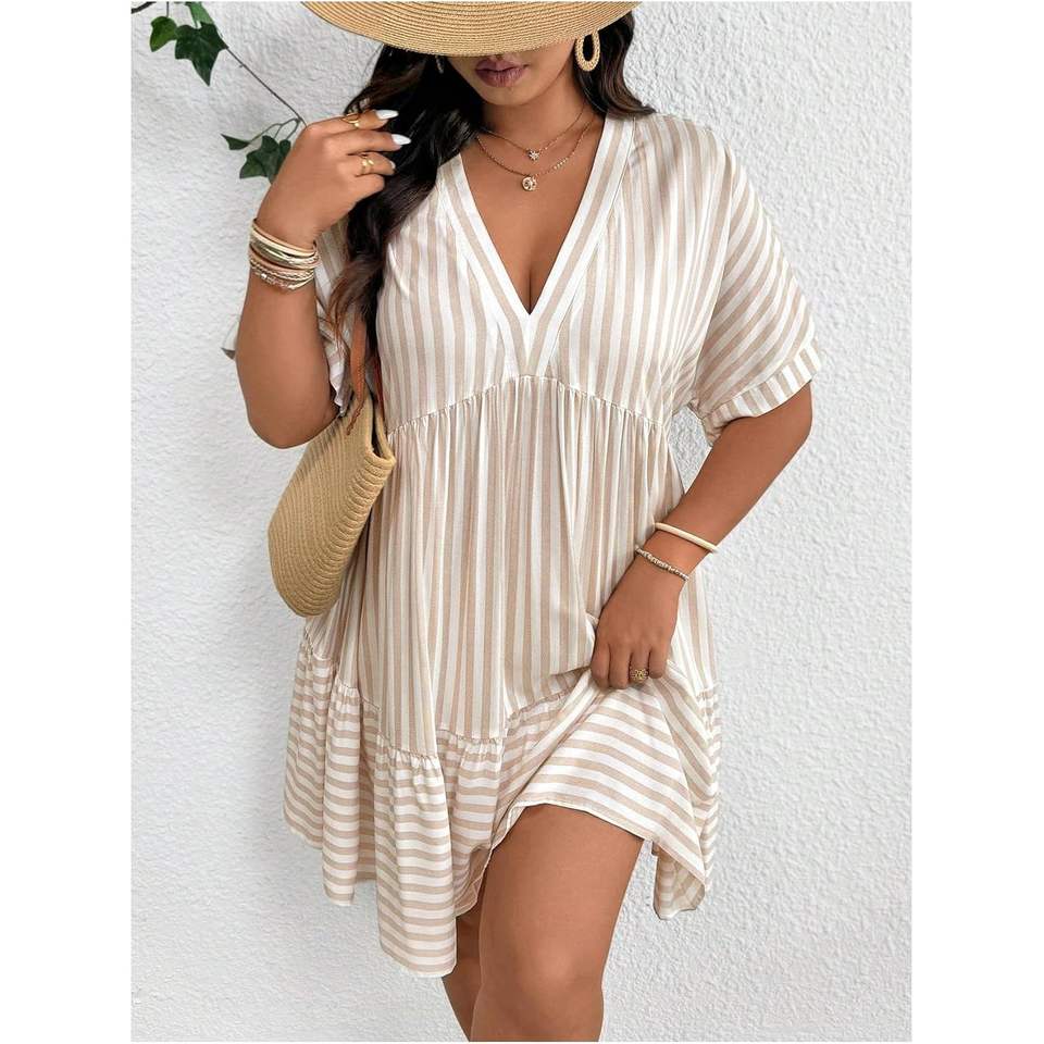 Custom Women's Plus Size Striped Ruffle Dress Empire Waist V Neck Half Sleeve Loose Chiffon Summer Babydoll Dress