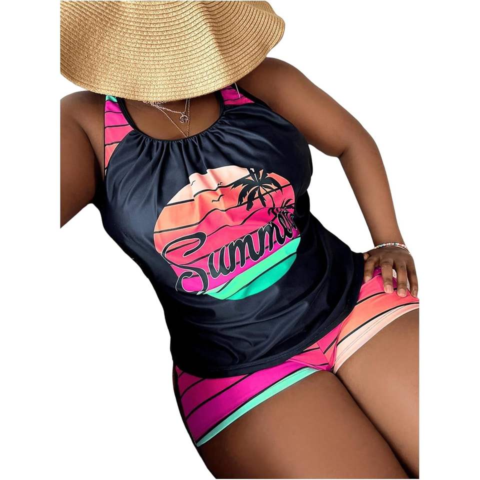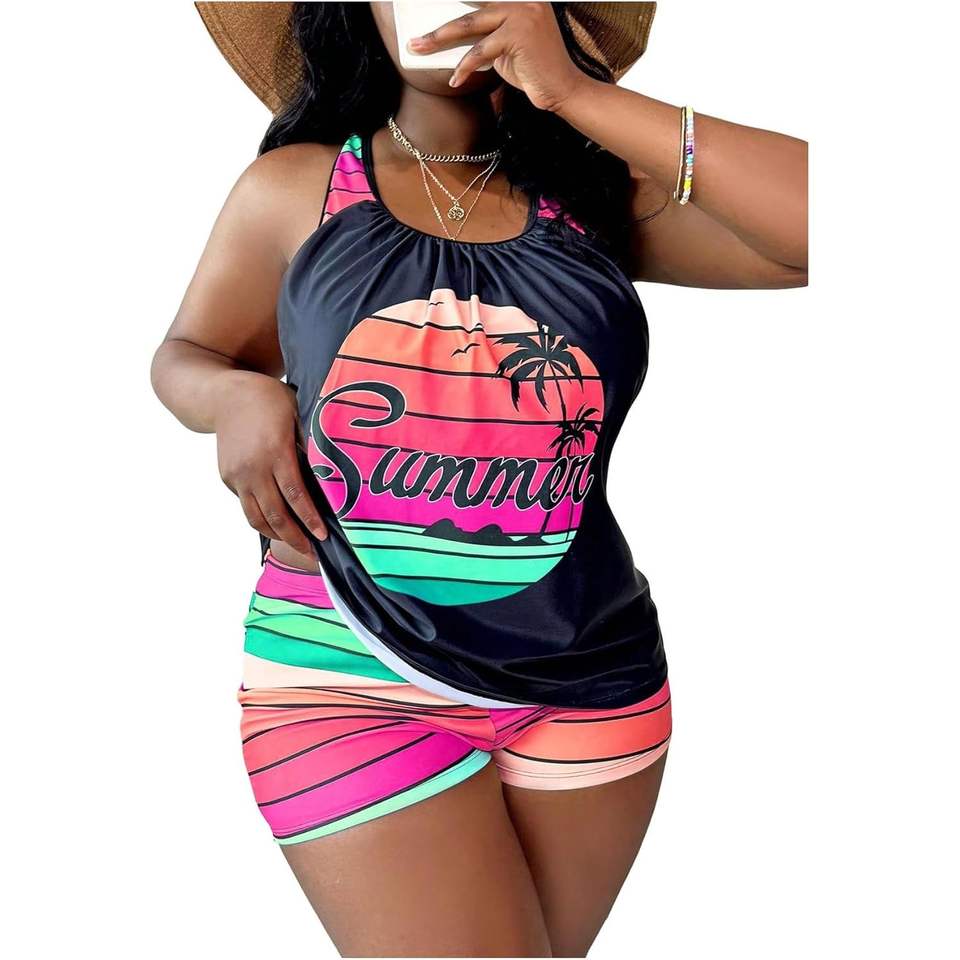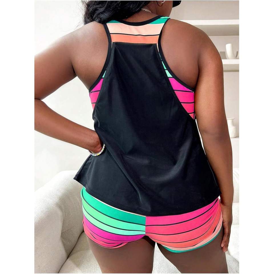 ชุดว่ายน้ำแทงกินี่ผู้หญิงไซส์พลัสแบบสั่งทำพิเศษ ชุด 2 ชิ้น ลายทางพิมพ์ลายทรอปิคอล ขอบตัดสี คอทรงกลม