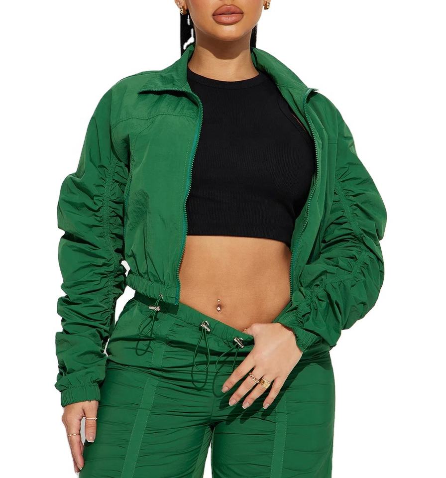 ชุดวอร์มกันลมผ้าไนลอนแบบซิปสำหรับผู้หญิงเสื้อแจ็คเก็ตและกางเกงผ้าโพลีเอสเตอร์แบบปรับแต่งได้