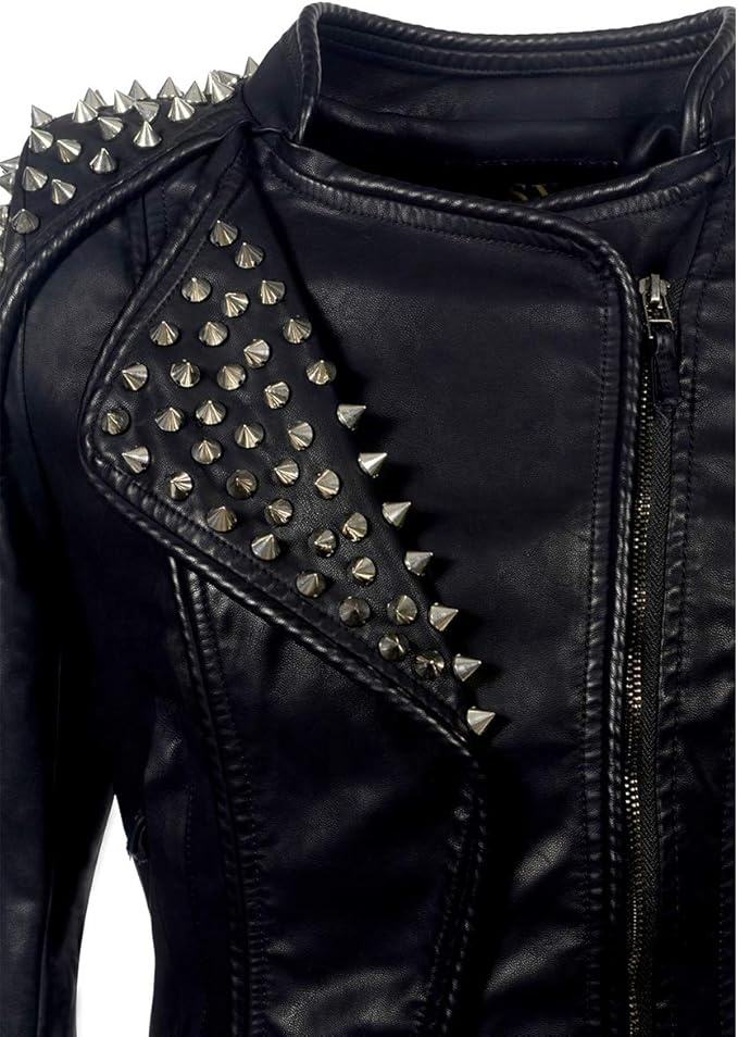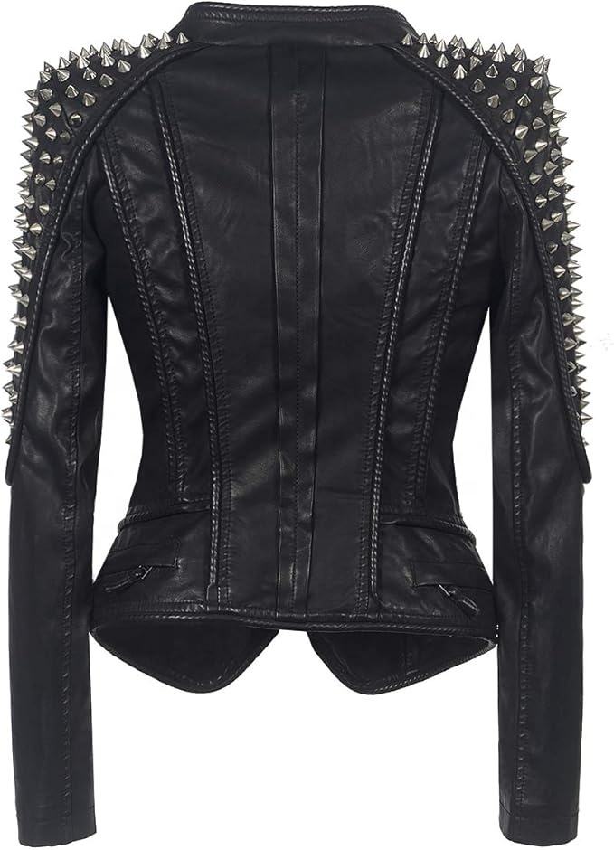 แจ็คเก็ตนักขี่จักรยานหนังเทียมมีซิปไม่สมมาตรสไตล์พังค์ออกแบบได้ตามต้องการสไตล์พังค์หมุดย้ำหนัง PU ด้านนอก