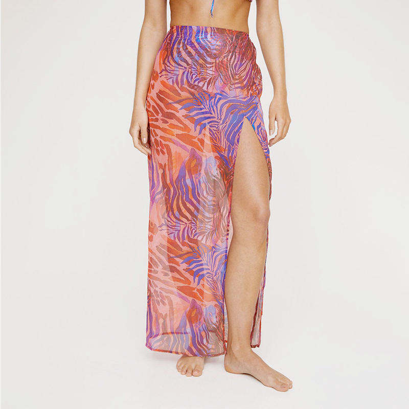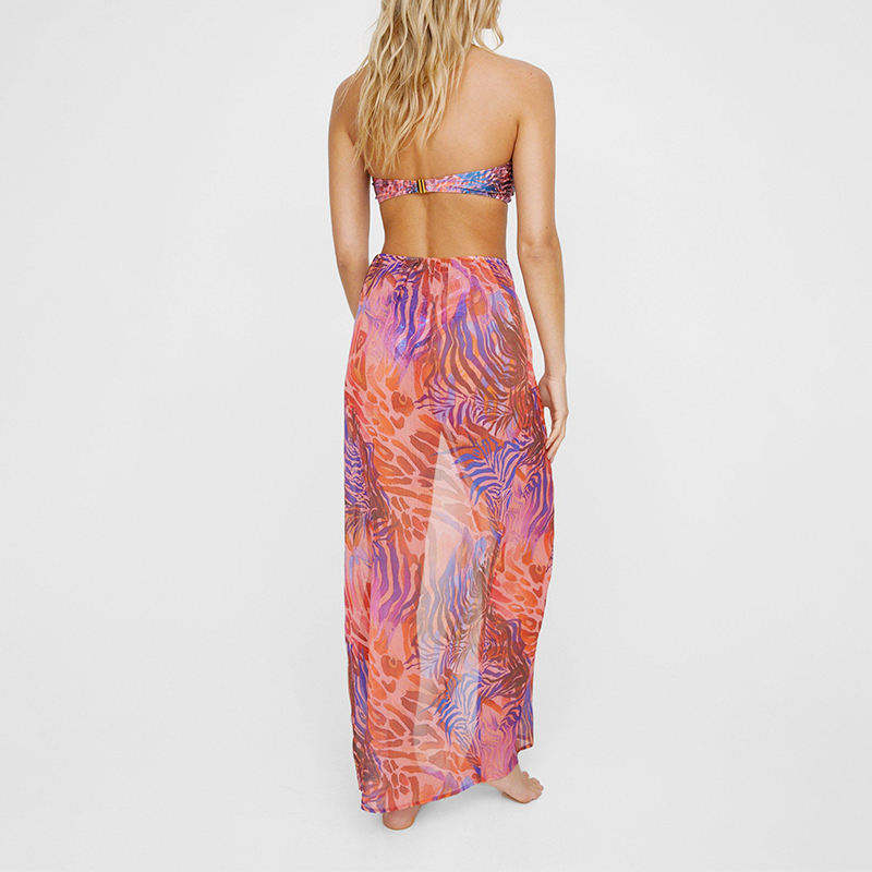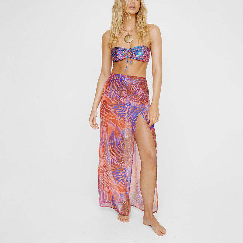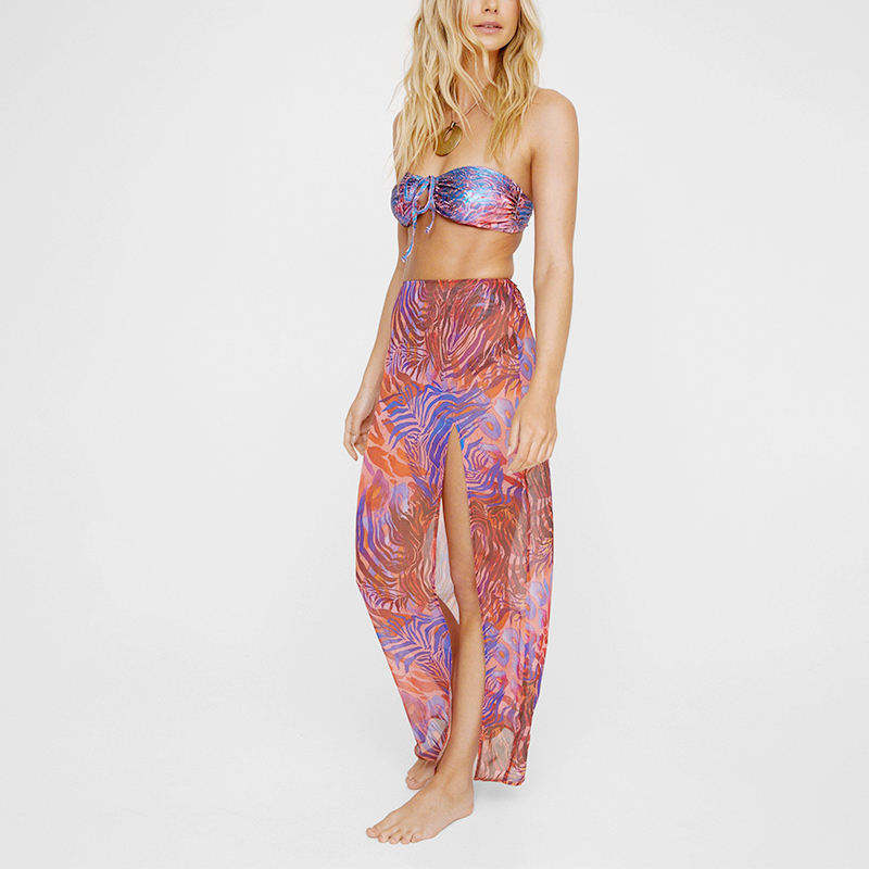 ชุดมินิเดรสผ้าตาข่ายซีทรูสำหรับผู้หญิง คอวีลึก แขนระบาย ทรงเข้ารูป คลุมชุดว่ายน้ำ เอวกระชับ ผ้าชีฟองกันยับ