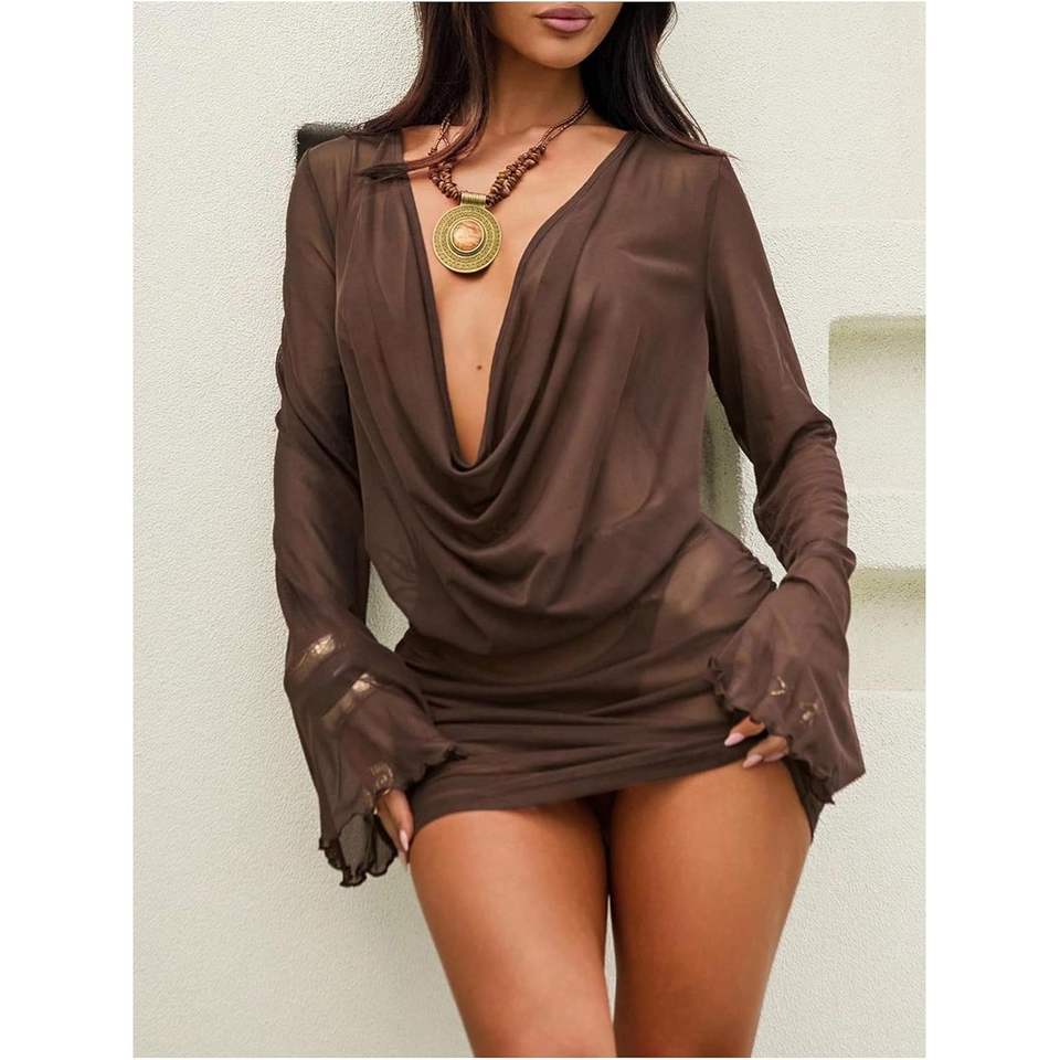ชุดมินิเดรสผ้าตาข่ายซีทรูสำหรับผู้หญิง คอวีลึก แขนระบาย ทรงเข้ารูป ใช้คลุมชุดว่ายน้ำ เอวเข้ารูป ผ้าชีฟอง ชุดชายหาด