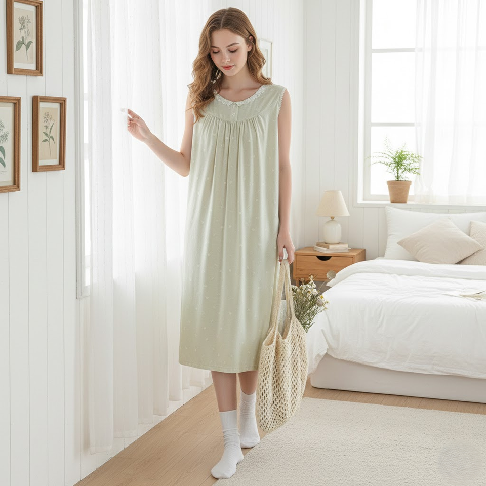 ชุดนอนผู้หญิงแขนกุดลายหัวใจ ผ้าถักเนื้อนุ่ม ระบายอากาศได้ดี ผสมผ้าฝ้าย สำหรับฤดูร้อน