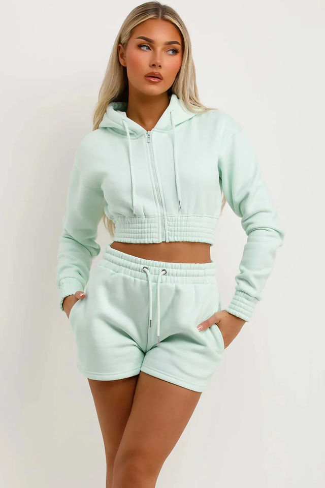 ชุดเล่นโยคะมีฮู้ดสองชิ้นสำหรับผู้หญิงชุดครอปท็อปและกางเกงขาสั้นเหนือเข่าชุดเล่นโยคะแฟชั่นลำลองตามสั่ง