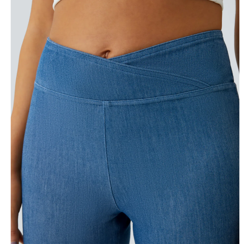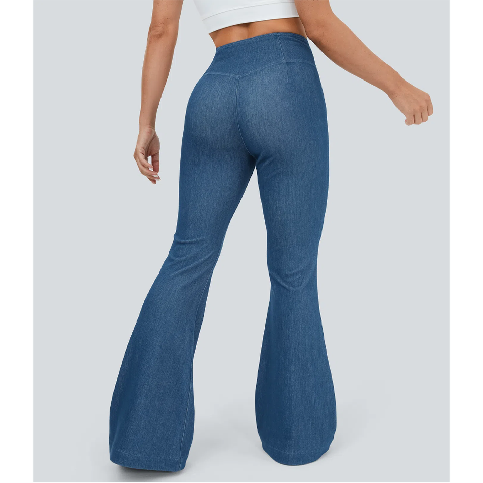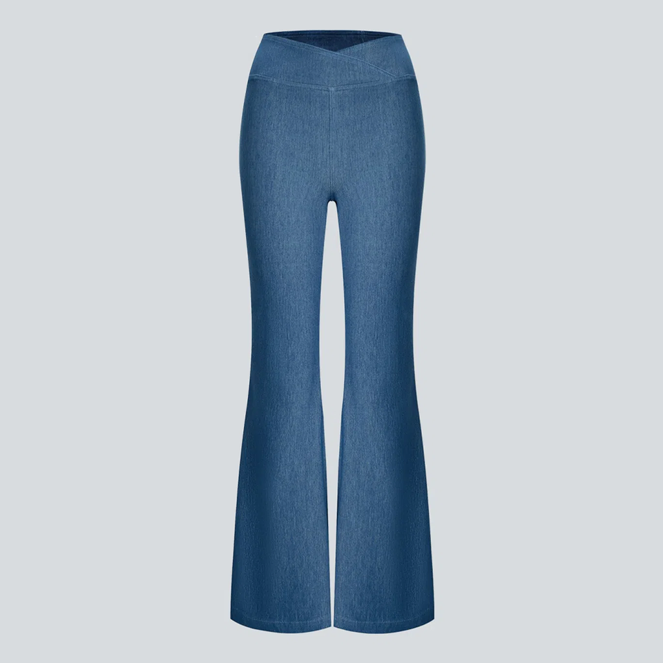 กางเกงยีนส์เอวสูงทรงตรงสำหรับผู้หญิง รุ่นขาบานทรงสลิม ดีไซน์เจาะรูแบบวินเทจ