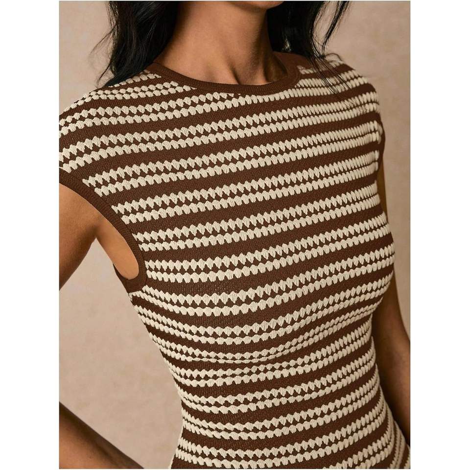 เดรสไหมพรมแขนสั้นคอวีลายทางสำหรับผู้หญิง ทรงเข้ารูป ระบายอากาศได้ดี เหมาะสำหรับใส่ลำลองในฤดูร้อน