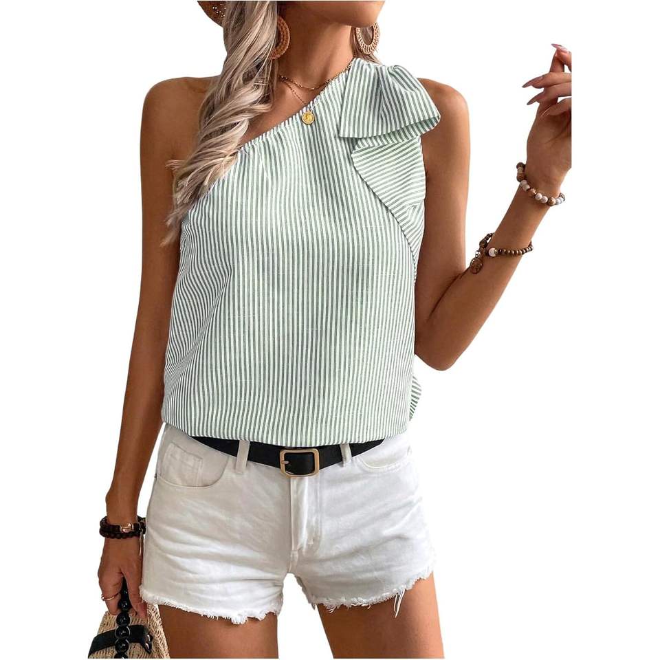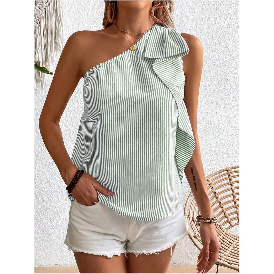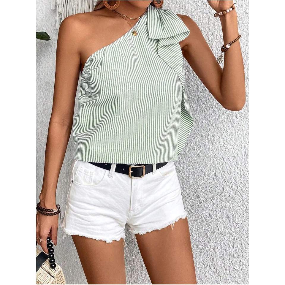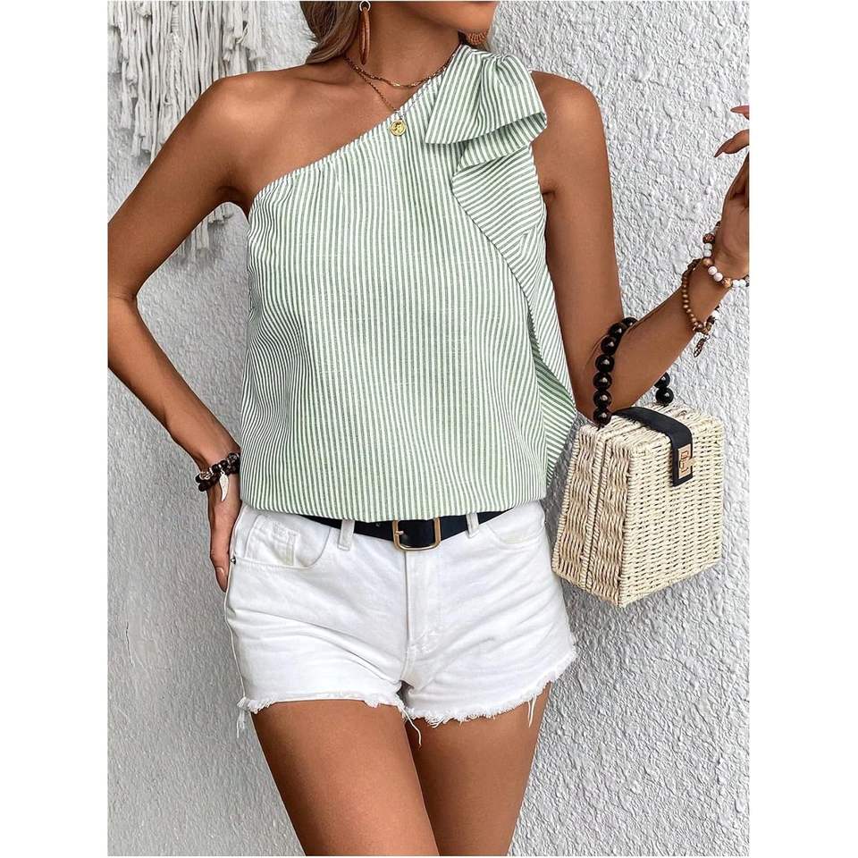 เสื้อผู้หญิงลายทางแบบไหล่เดียว แขนกุด เสื้อฤดูร้อนลำลองสำหรับวันหยุด ผ้าป๊อปลินระบายอากาศได้ดี