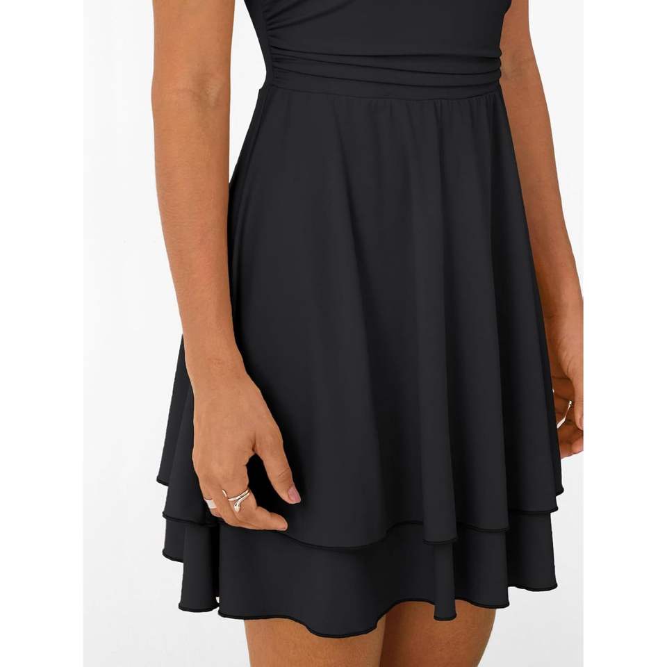 ชุดมินิเดรสสำหรับปาร์ตี้ฤดูร้อนของผู้หญิงชุดเดรสคอเหลี่ยมแต่งระบายมีชายระบายเอวสั้นแฟชั่นมิกซ์สำหรับวัน