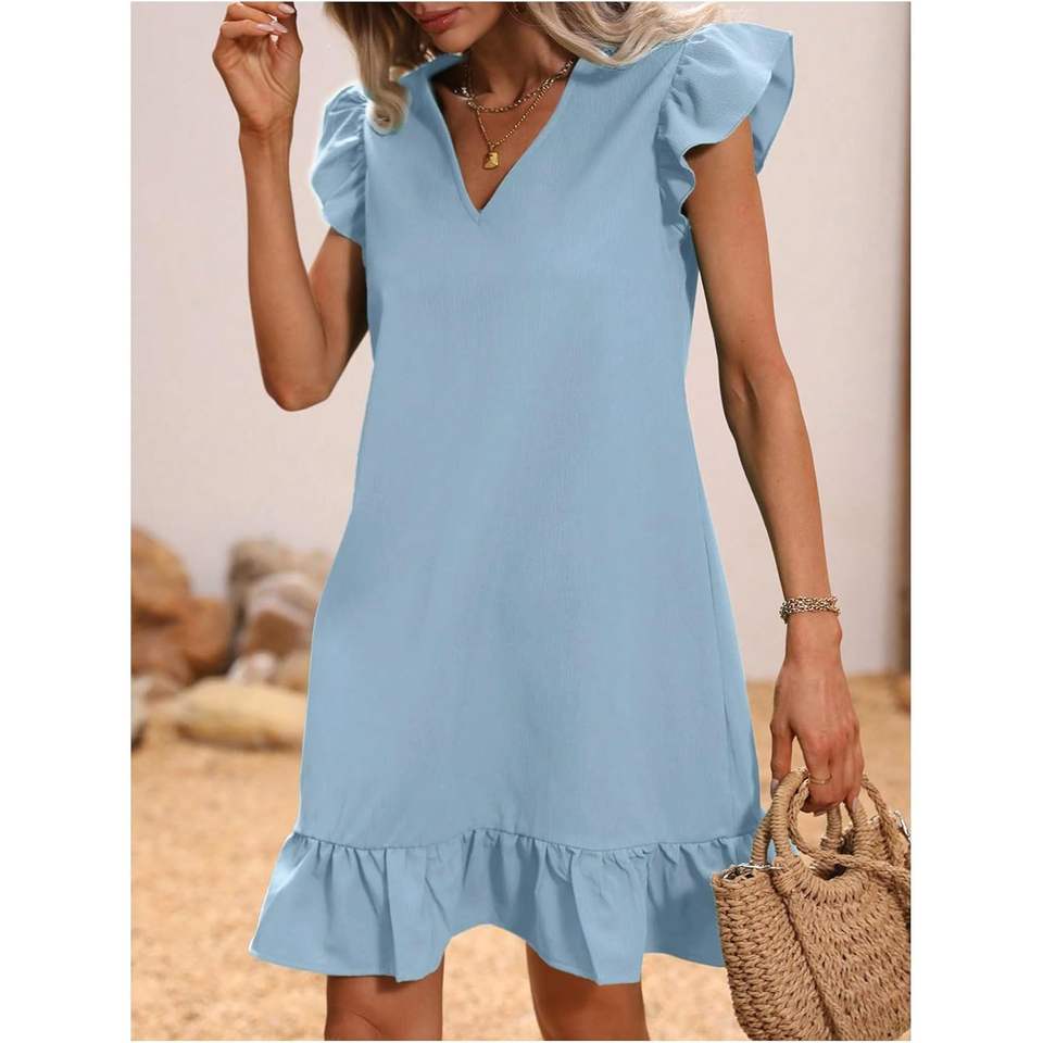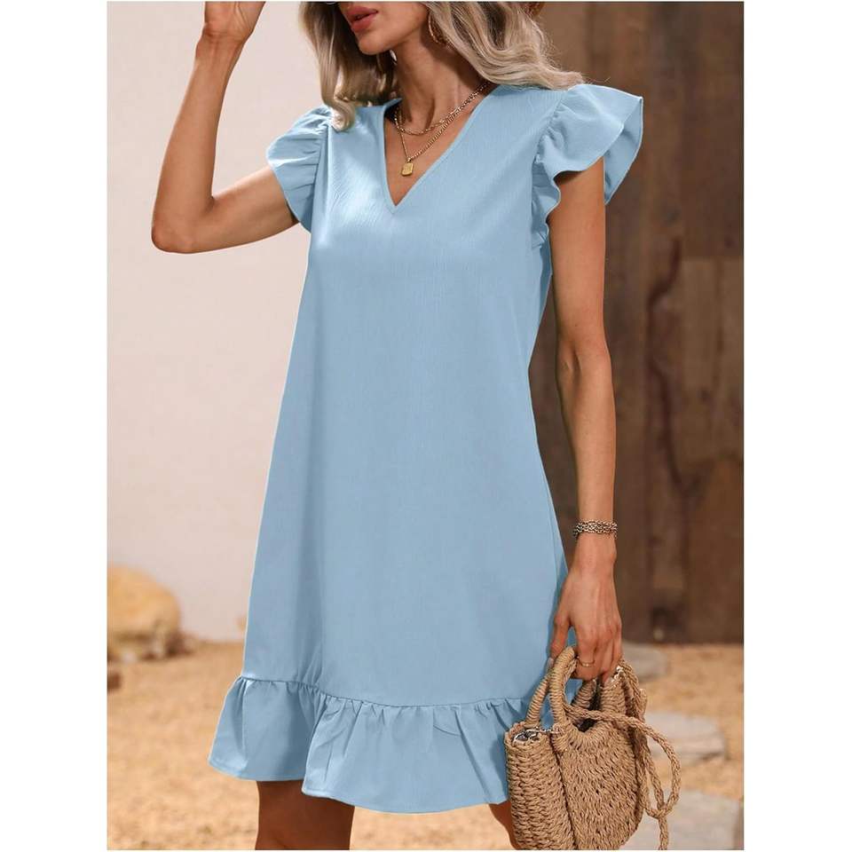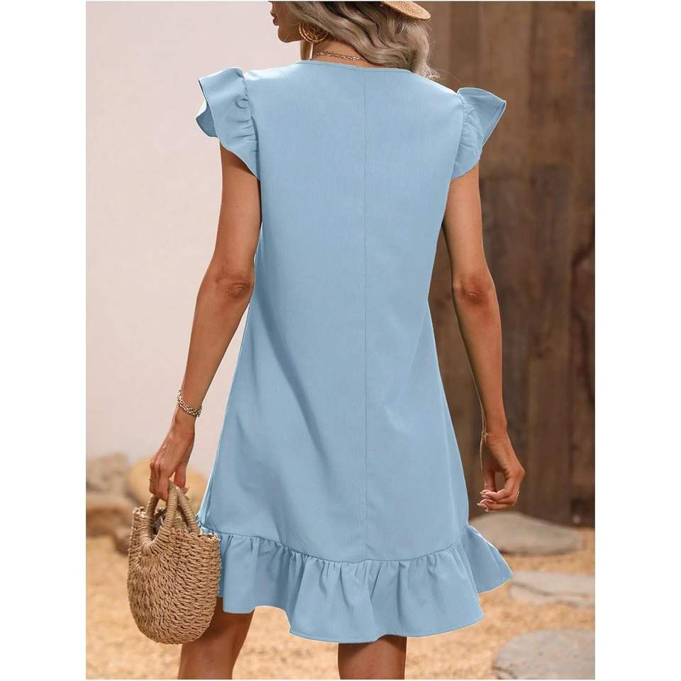 ชุดเดรสลำลองทรงเอสำหรับผู้หญิง คอวี แขนสั้น แต่งระบายชายกระโปรง ผ้าทอระบายอากาศ เอวยางยืด เหมาะสำหรับใส่ในชีวิตประจำวันช่วงฤดูร้อน