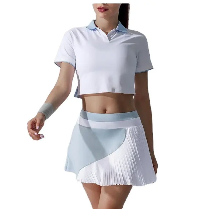 ชุดเทนนิสผู้หญิงแบบกำหนดเอง ชุดกีฬาเสื้อครอปคอปกโปโลระบายอากาศแห้งเร็วพร้อมกระโปรง รับผลิตแบบ OEM ODM