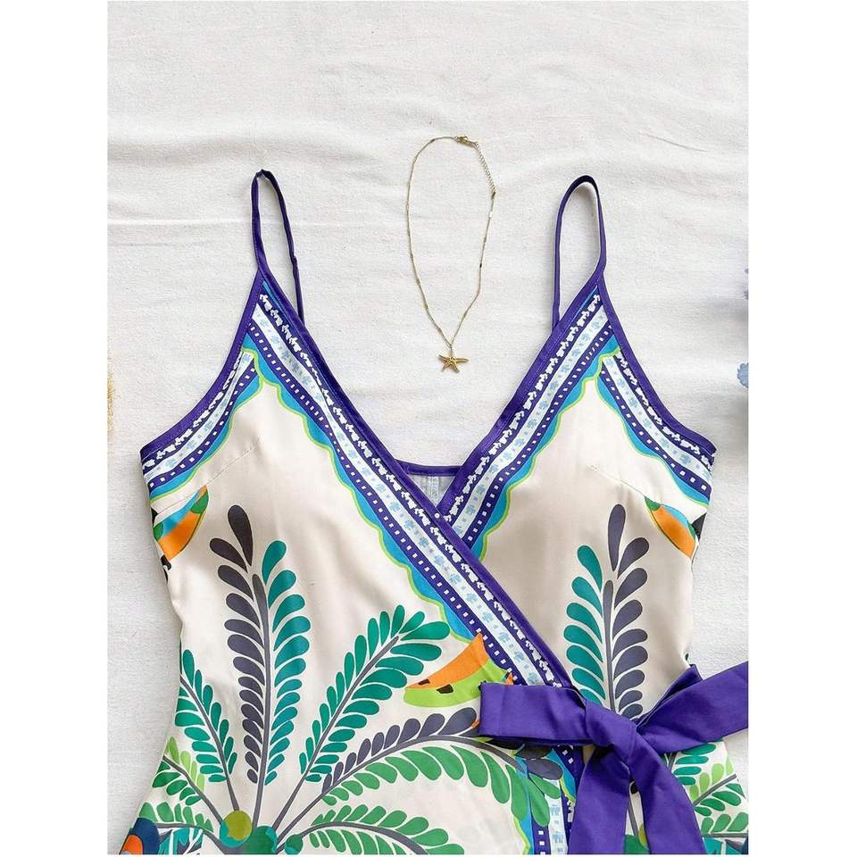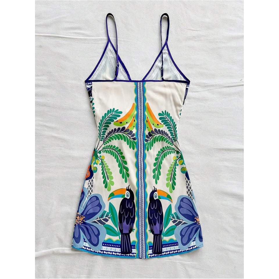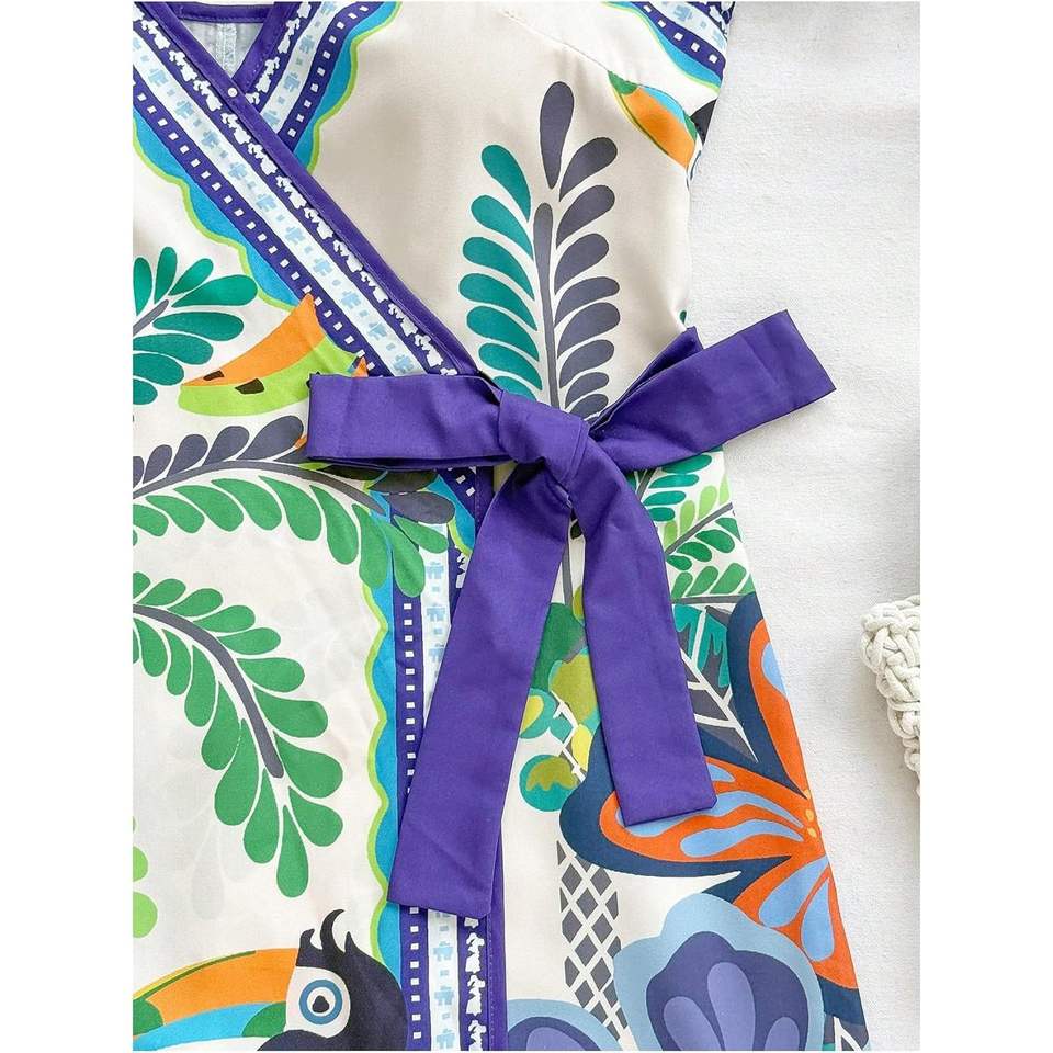 เดรสสั้นพิมพ์ลายทรอปิคอลสำหรับผู้หญิง คอวี ผูกเอว ชุดเดรสสำหรับวันหยุดฤดูร้อน ผ้าโพลีเอสเตอร์ยืดได้ 100%