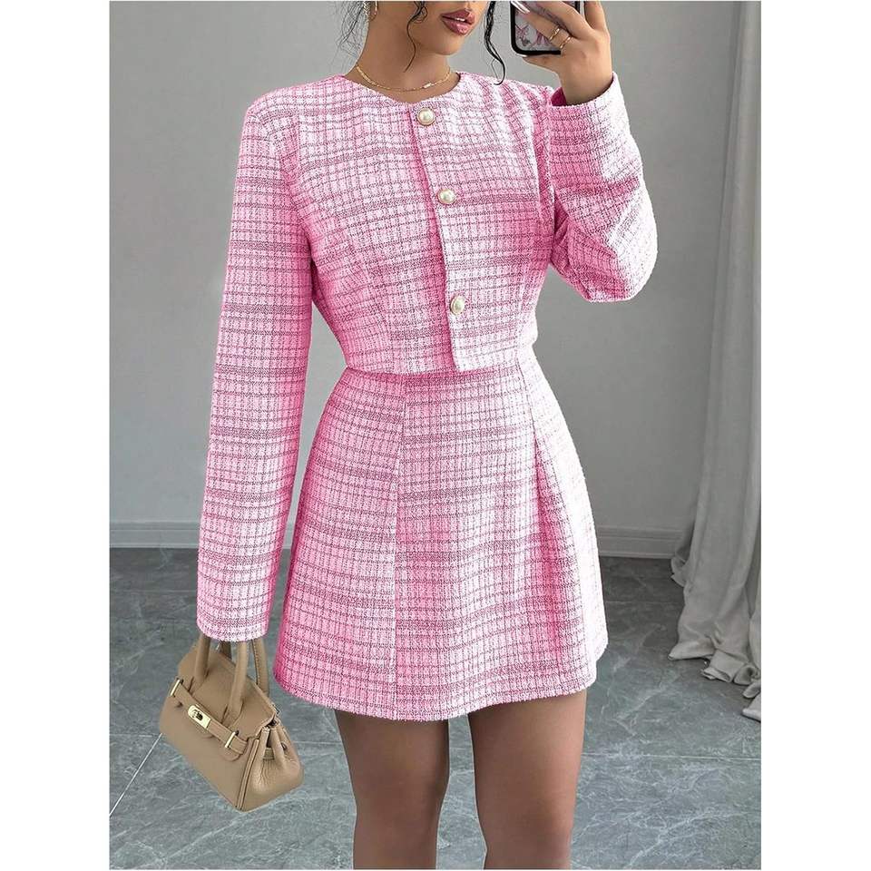 ชุดทวีดผู้หญิงแบบสั่งตัด 2 ชิ้น เสื้อเบลเซอร์แขนยาวและเดรสสั้นแบบไม่มีแขนพร้อมดีเทลกระดุม