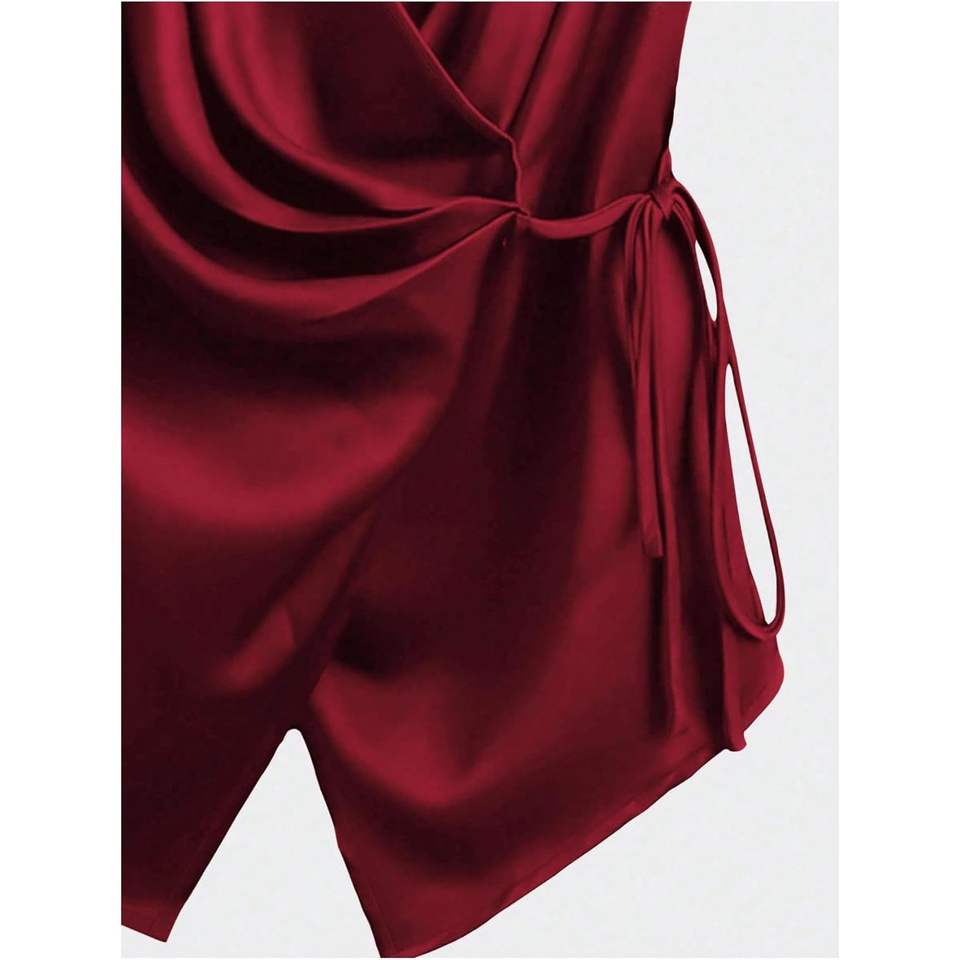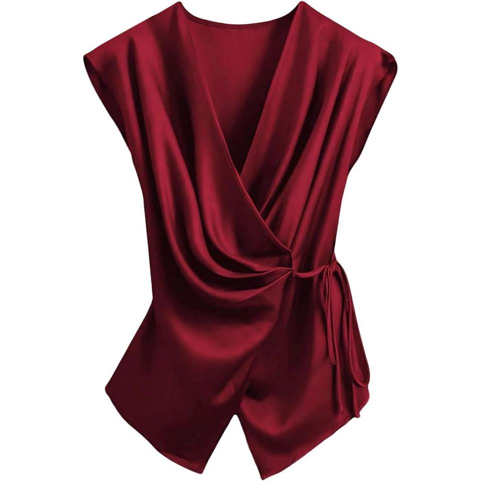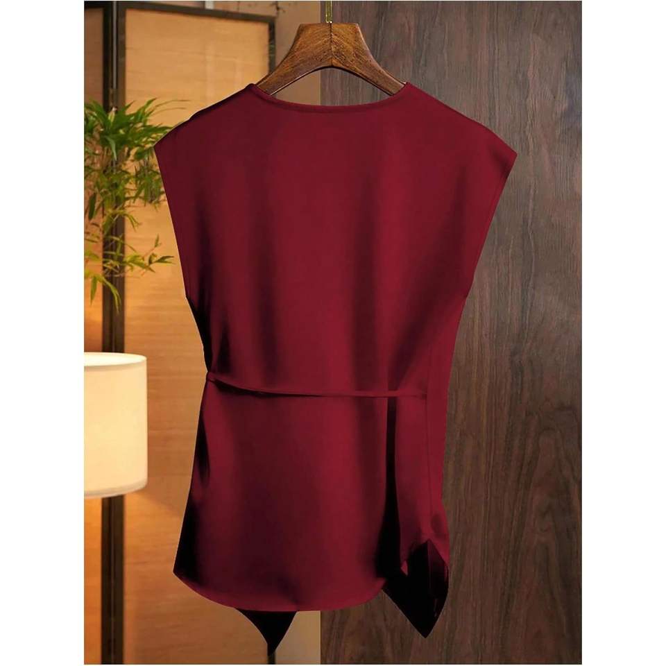 เสื้อผู้หญิงคอวีผ้าซาตินแบบผูกเอว แขนกุด สไตล์ลำลองสำหรับธุรกิจ ใส่ได้ในฤดูร้อน ผ้าไม่ยับ