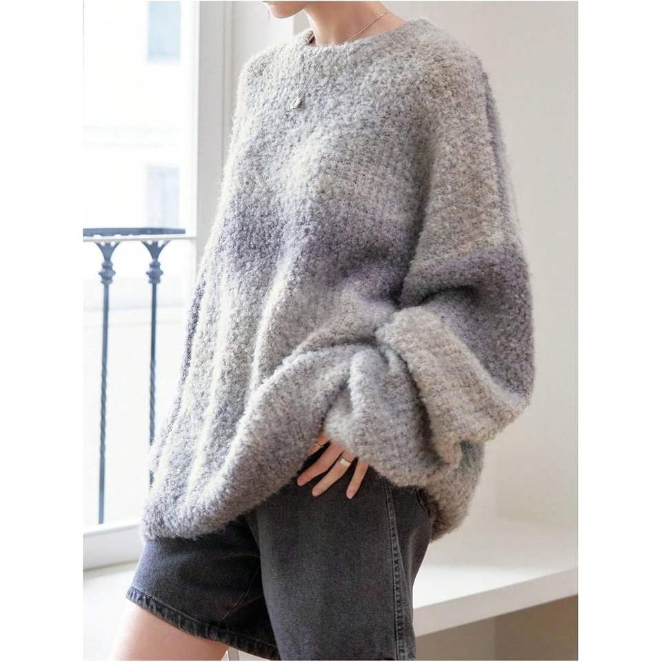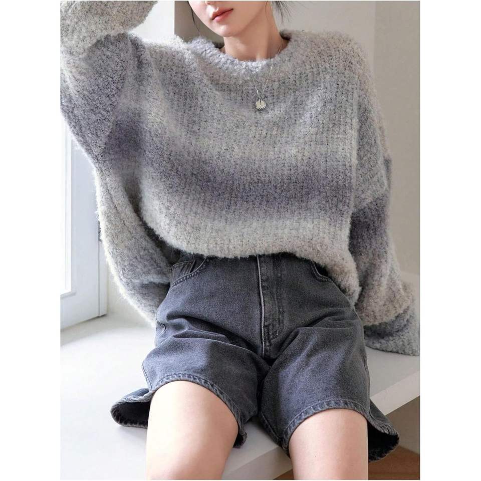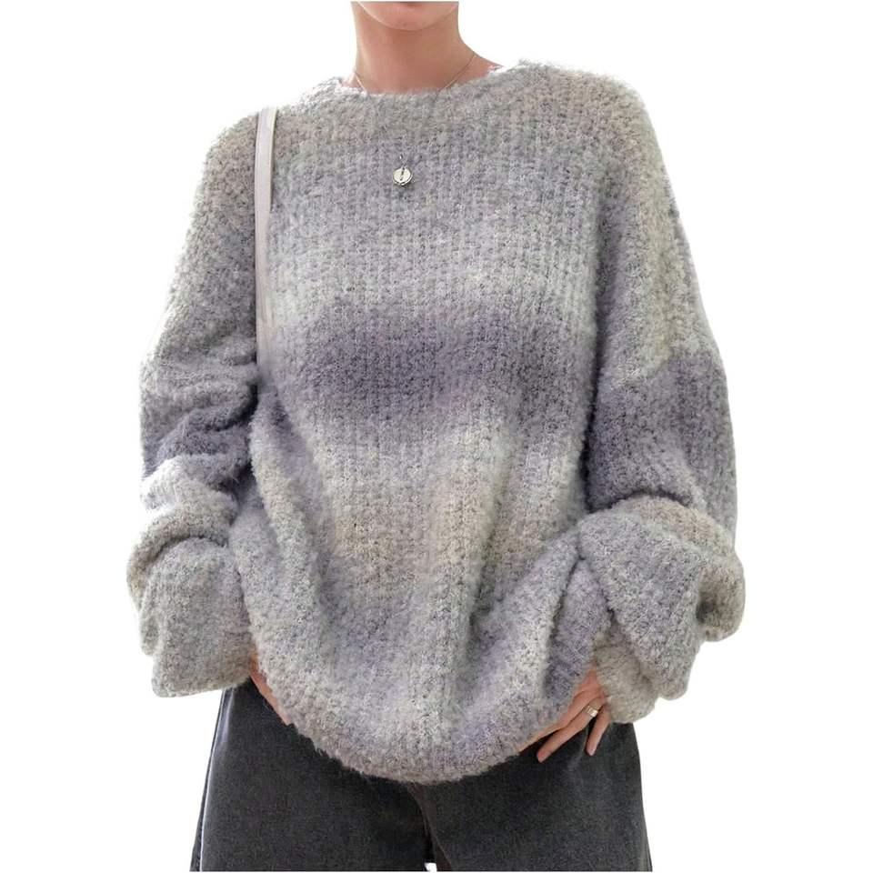 เสื้อสเวตเตอร์ไหมพรมทรงโอเวอร์ไซส์สไตล์วินเทจสำหรับผู้หญิง คอกลม แขนยาว เสื้อกันหนาว ป้องกันขนร่วง อุ่นสบาย