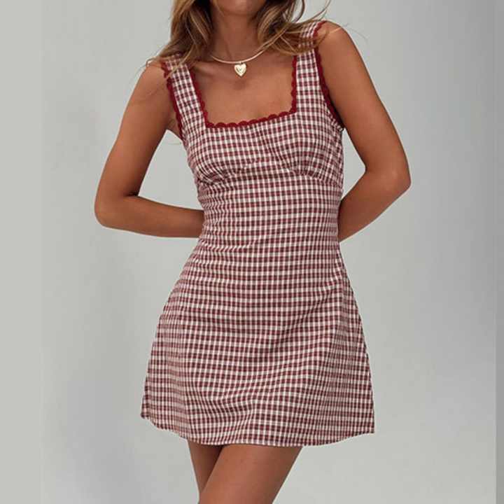 เดรสสั้นลายสก็อตคอเหลี่ยมแต่งลูกไม้เซ็กซี่ทรงเข้ารูปสำหรับผู้หญิง ดีไซน์เรียบหรู แขนกุด ผ้าฝ้ายลายตาราง