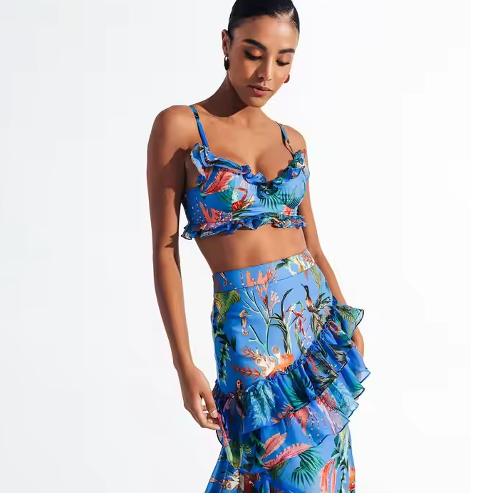 ชื่อผลิตภัณฑ์:กระโปรงสองชิ้นเสื้อเอวลอยลายดอกไม้ไม่สมมาตรตามสั่ง