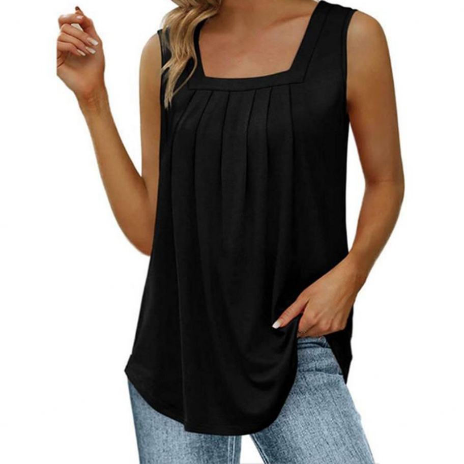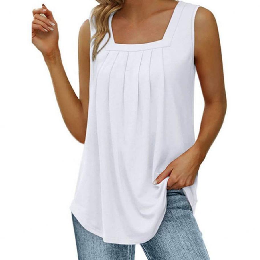 เสื้อแขนกุดคอเหลี่ยมสีพื้นสำหรับผู้หญิง พร้อมกางเกงยีนส์สีน้ำเงินสำหรับเดินเล่นในเมืองแบบสบายๆ