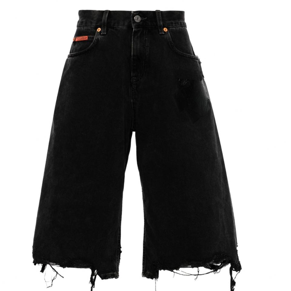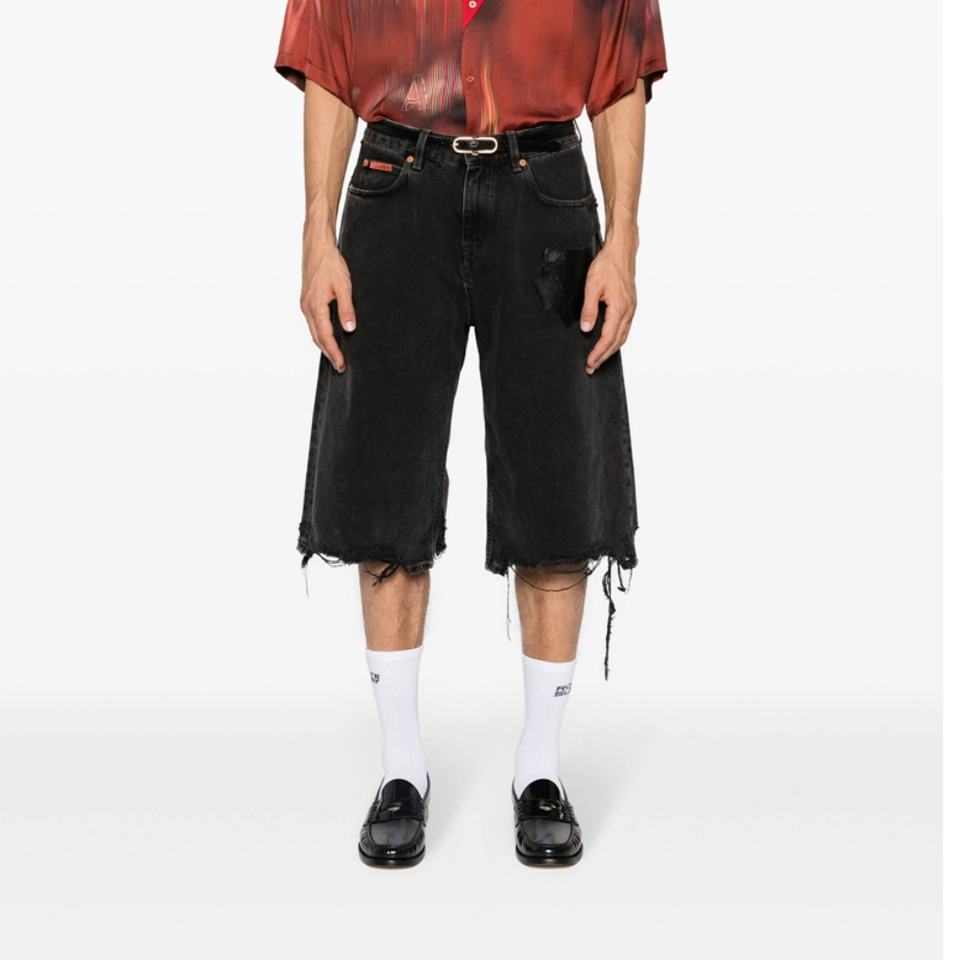 กางเกงยีนส์ขาสั้นผู้ชายแบบใหม่สำหรับออกกำลังกาย แต่งขอบขาดดิบ ปักโลโก้ที่กระดุมและปะติด