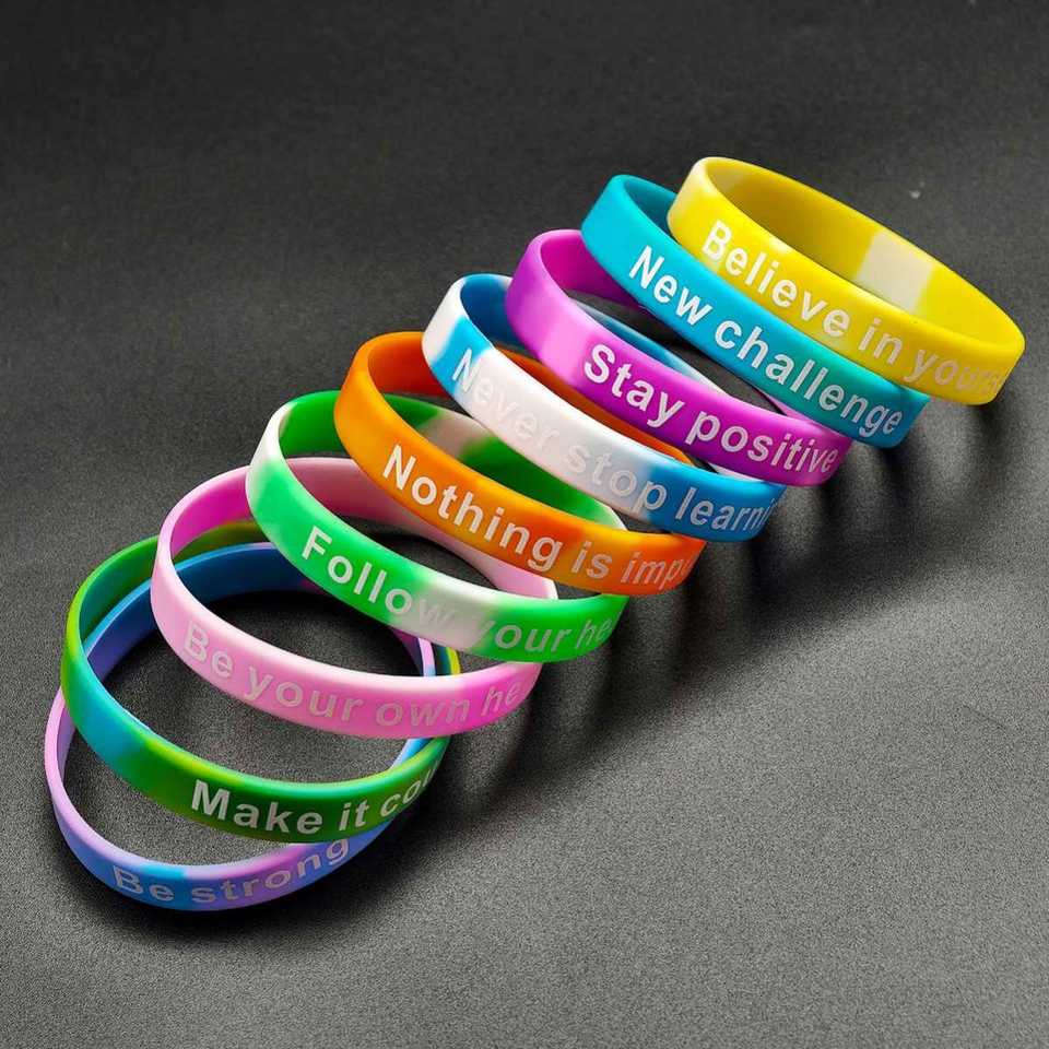 สายรัดข้อมือแบบกำหนดเองสำหรับงานอีเวนต์ การระดมทุน และโปรโมชั่น เพิ่มข้อความ ไอคอน และโลโก้ กำไลยางแบบขายส่ง