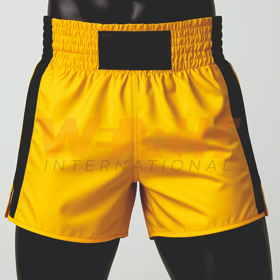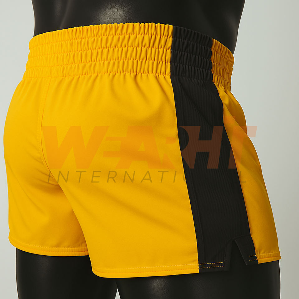 กางเกงขาสั้นฝึกซ้อมมวยไทยขาสั้นเอวกลางแบบลำลองสีดำและเหลืองออกแบบได้ตามต้องการ