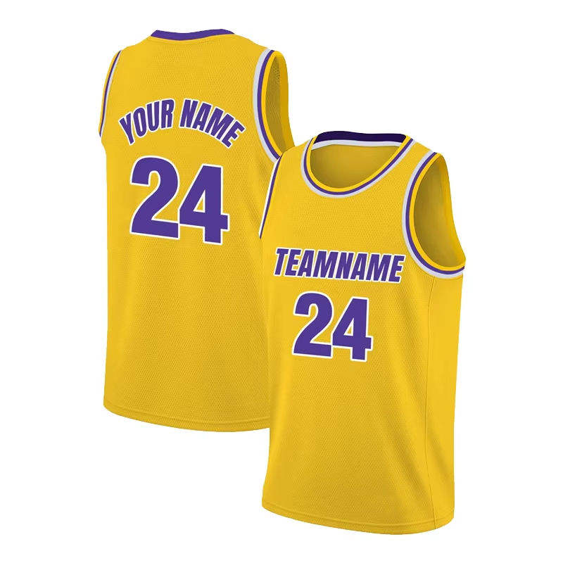 ชุดบาสเก็ตบอลสีเหลืองม่วงน้ำเงินและแดงแบบกำหนดเอง ปี 2026 ชุดยูนิฟอร์มปี 2025 แบบซับลิเมชั่นเต็มตัว ชุดทีมกีฬาอาชีพ คุณภาพสูง