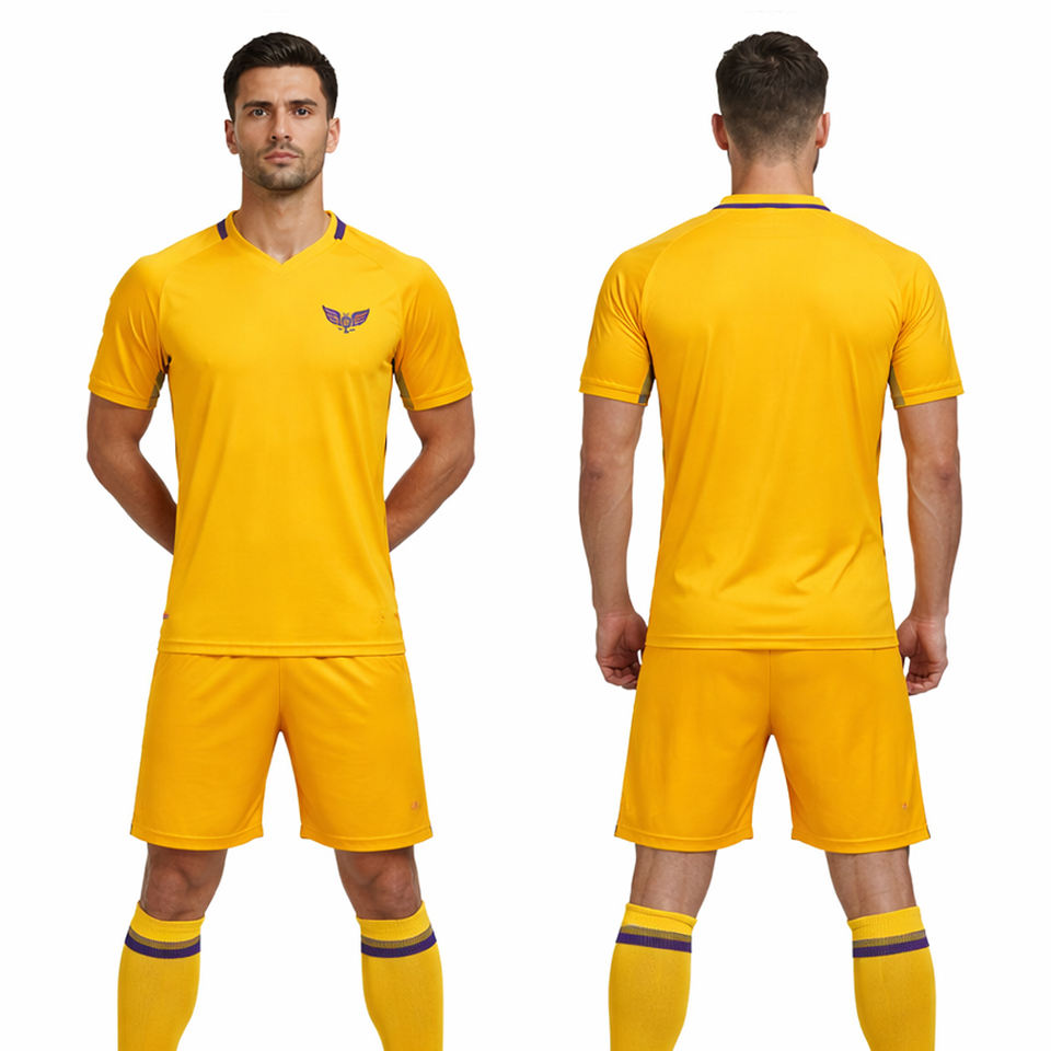 ชุดเสื้อฟุตบอลสีเหลืองแบบกำหนดเองสำหรับผู้ชาย ชุดฝึกซ้อม ชุดกีฬาระบายอากาศ ชุดทีมพร้อมกางเกงขาสั้น