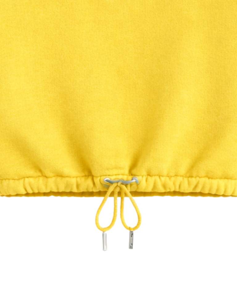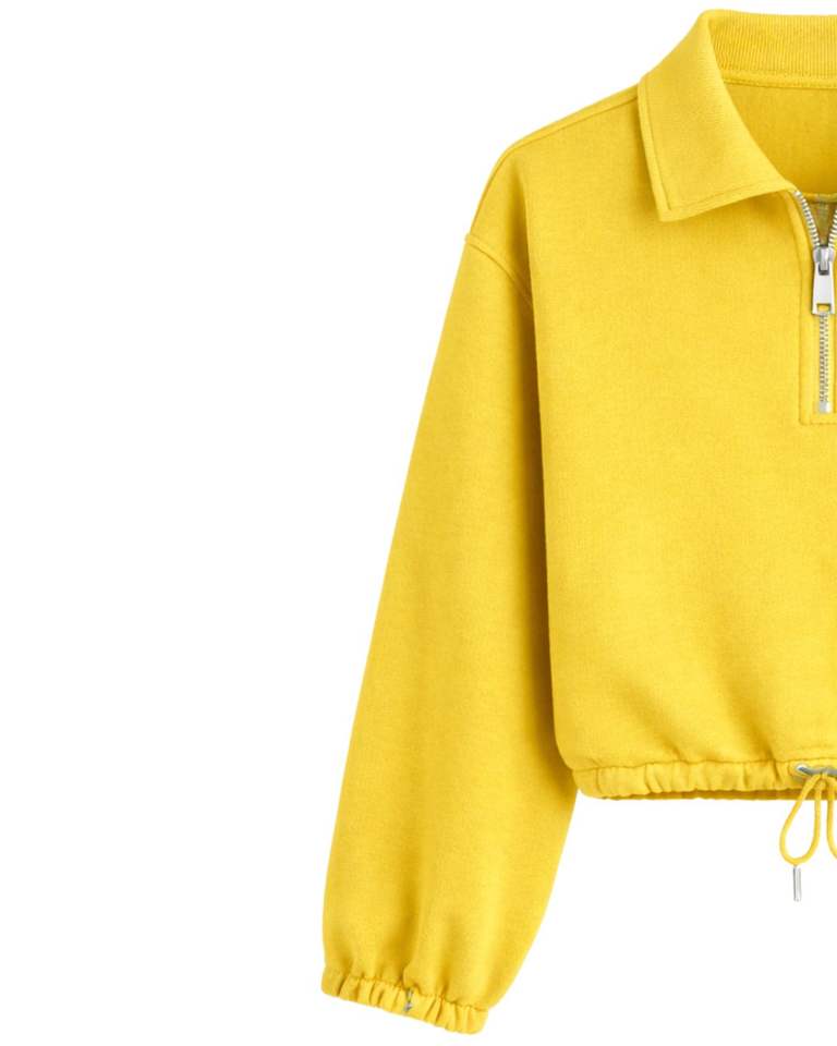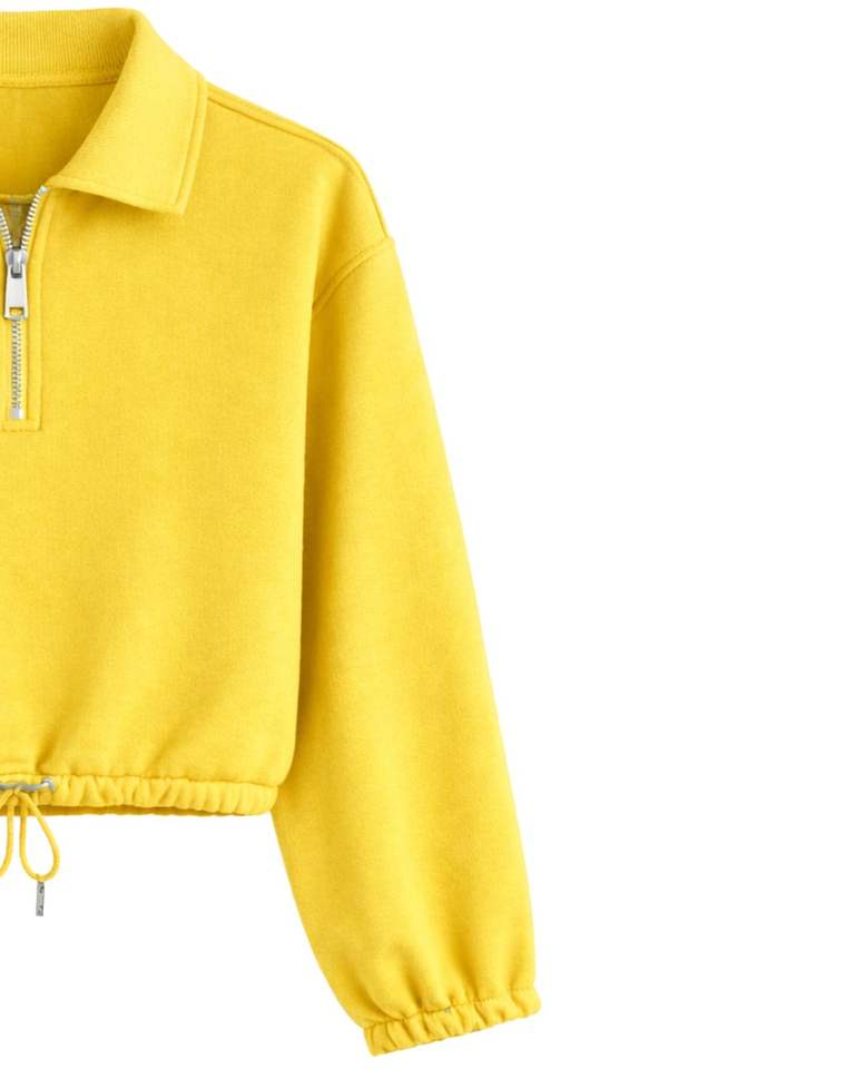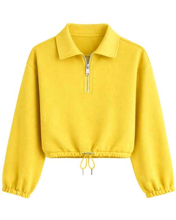 เสื้อฮู้ดครอปซิป ¼ ตัวสำหรับผู้หญิง สีเหลืองแบบกำหนดเอง ผ้าฟลีซแบบสวมหัว มีเชือกผูกชายเสื้อ ผ้าฝ้ายผสมโพลีเอสเตอร์เนื้อนุ่ม เหมาะสำหรับฤดูหนาว