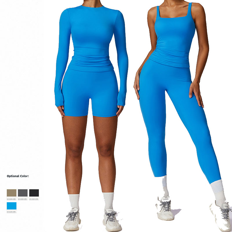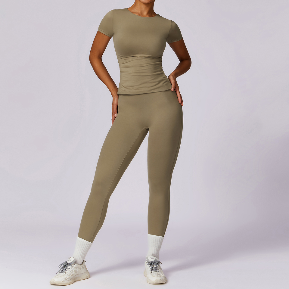 ชุดโยคะแบบกำหนดเองสำหรับผู้หญิง เสื้อครอปท็อป 2 ชิ้น พร้อมกางเกงเลกกิ้งเอวยางยืด ด้านหน้าและเอวมีโลโก้ สีตามสั่ง