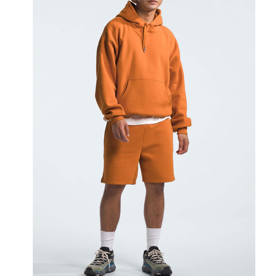 ชุดเสื้อมีฮู้ดและกางเกงขาสั้นสองชิ้นสำหรับผู้ชายชุดเสื้อผ้าสำหรับทั้งชายและหญิงแขนยาวเข่ายาวแบบเรียบโลโก้ที่กำหนดเอง