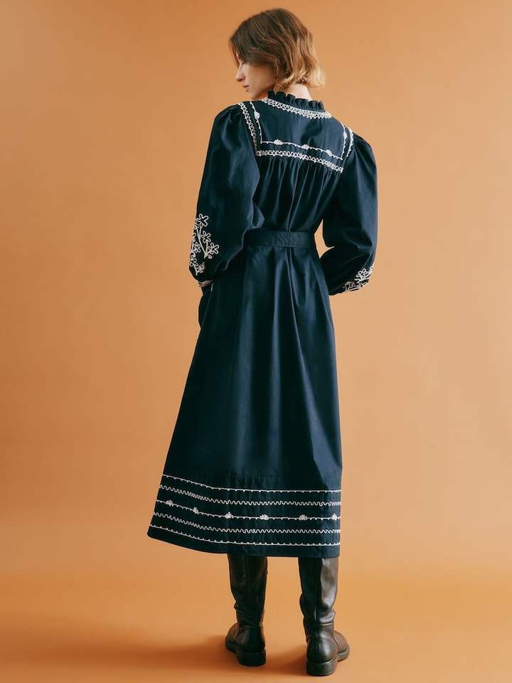 ชุดเดรสยาวคลุมเข่าคอกลมแขนพองพร้อมสายรัดสำหรับ100% ลำลองปักลายฤดูร้อนฤดูใบไม้ผลิ